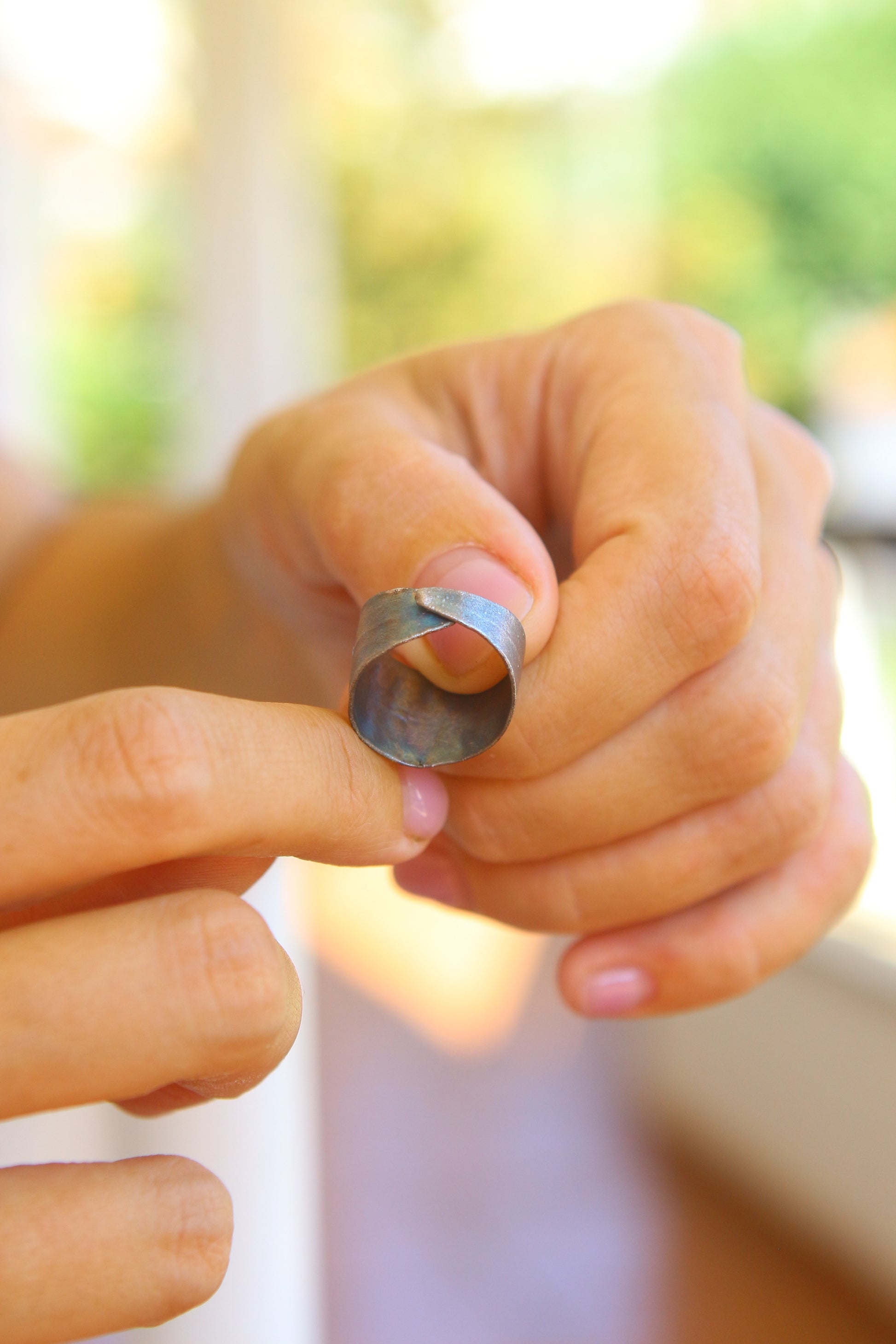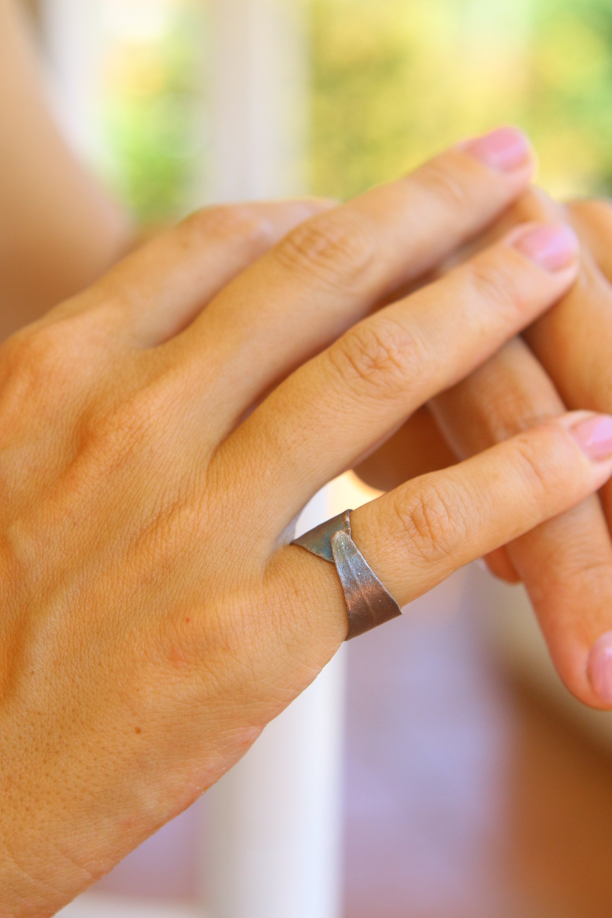 Anel com folha de árvore-de-ferro em prata colorida. Tamanho ajustável.