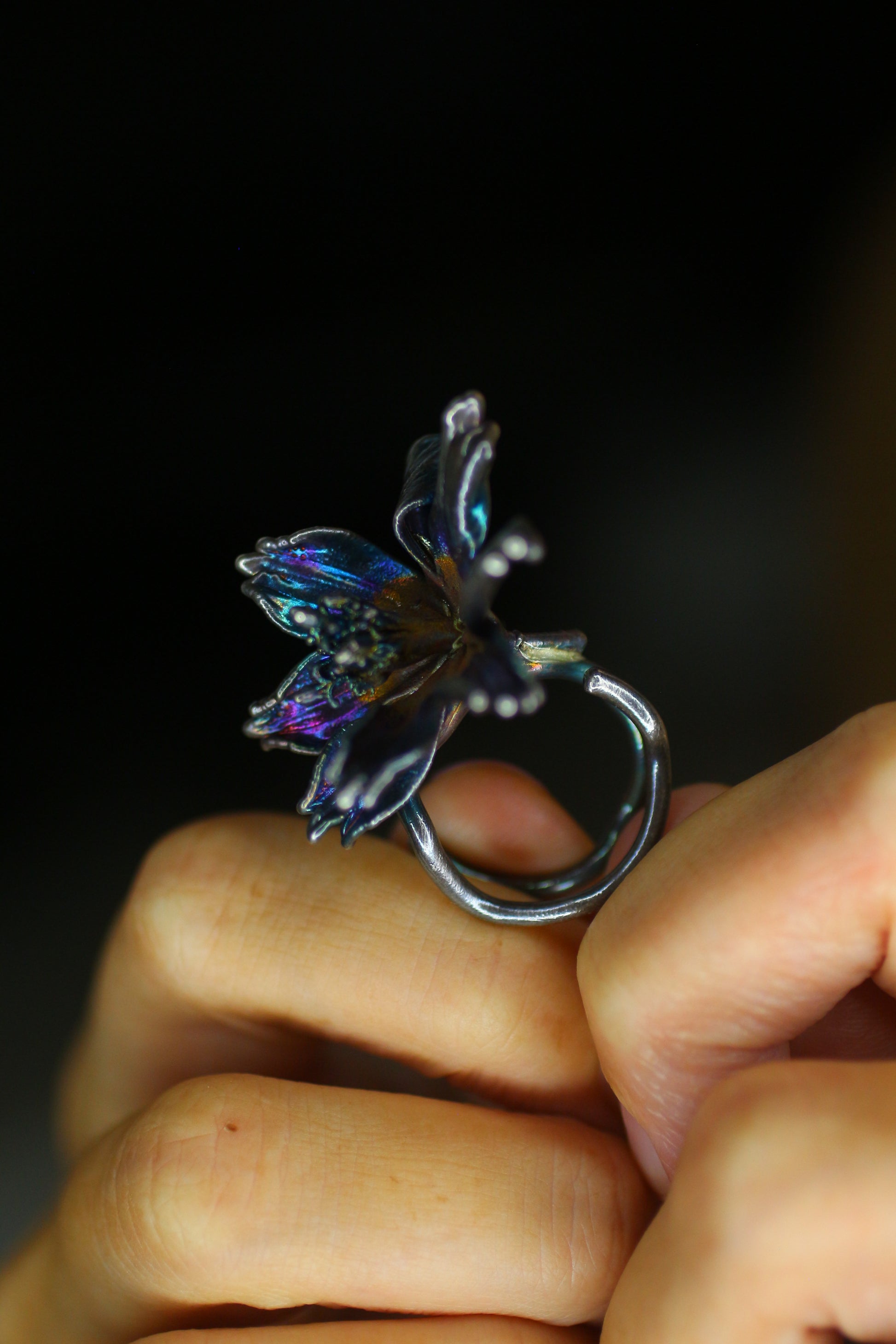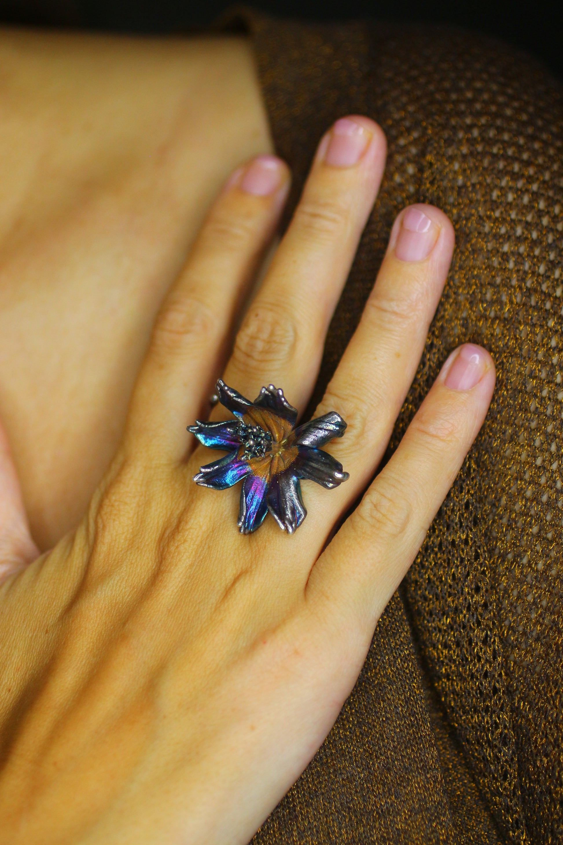 Anel com flor de cosmos em prata colorida. Tamanho ajustável.