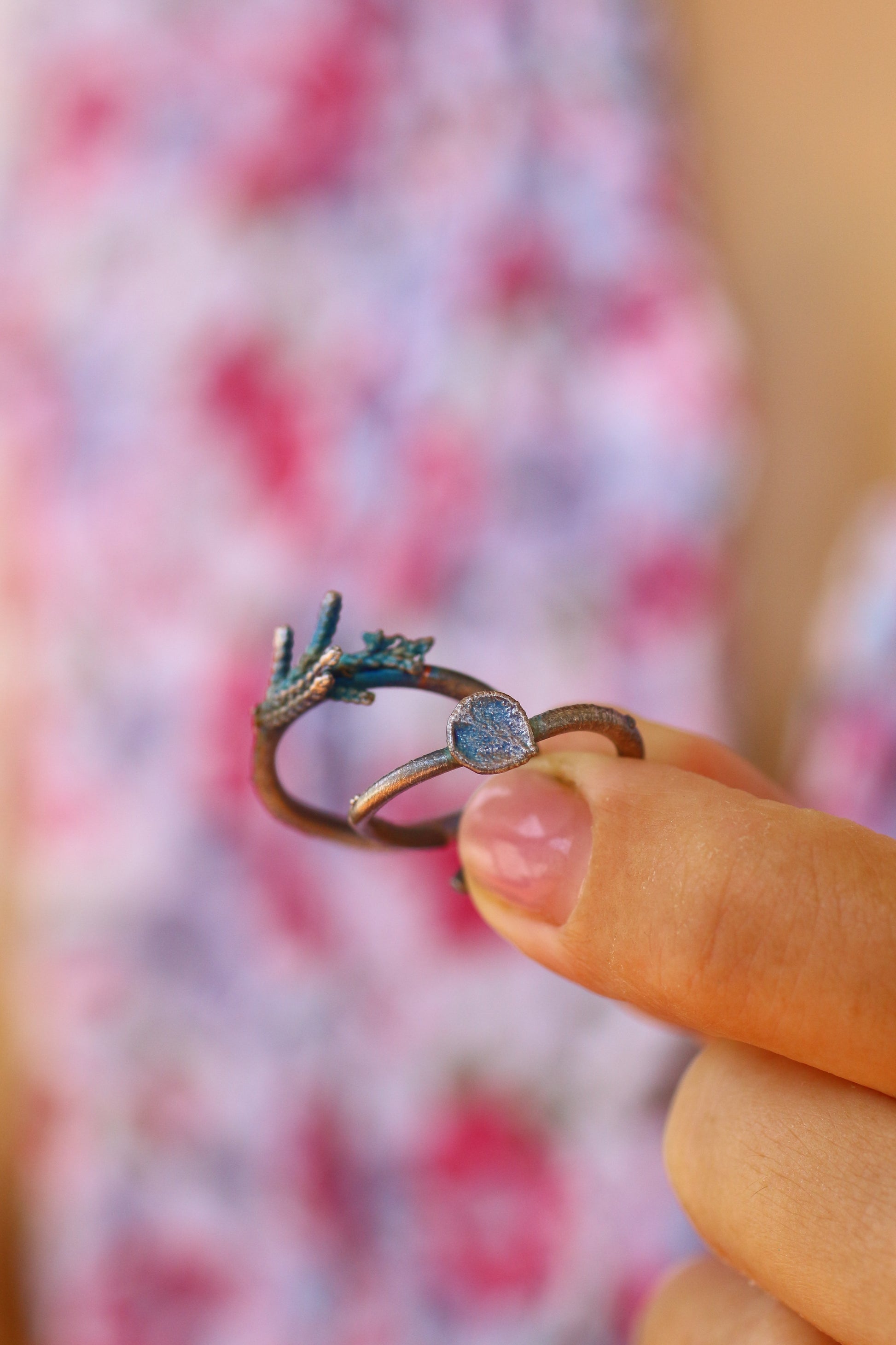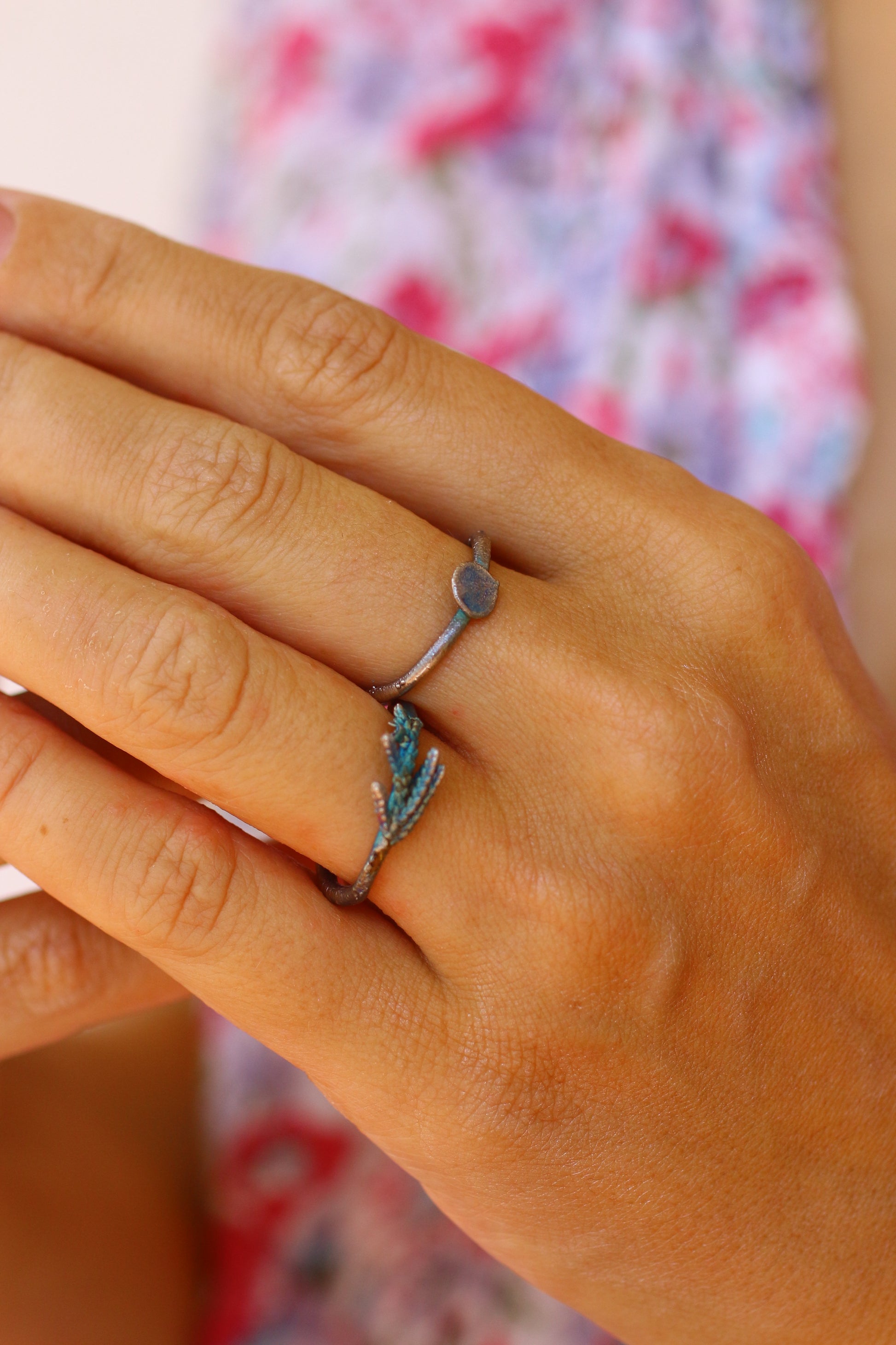 Um conjunto de dois anéis com uma pétala de hortênsia e um ramo de tuia, que podem ser usados tanto no mesmo dedo como em vários. Tamanho ajustável.