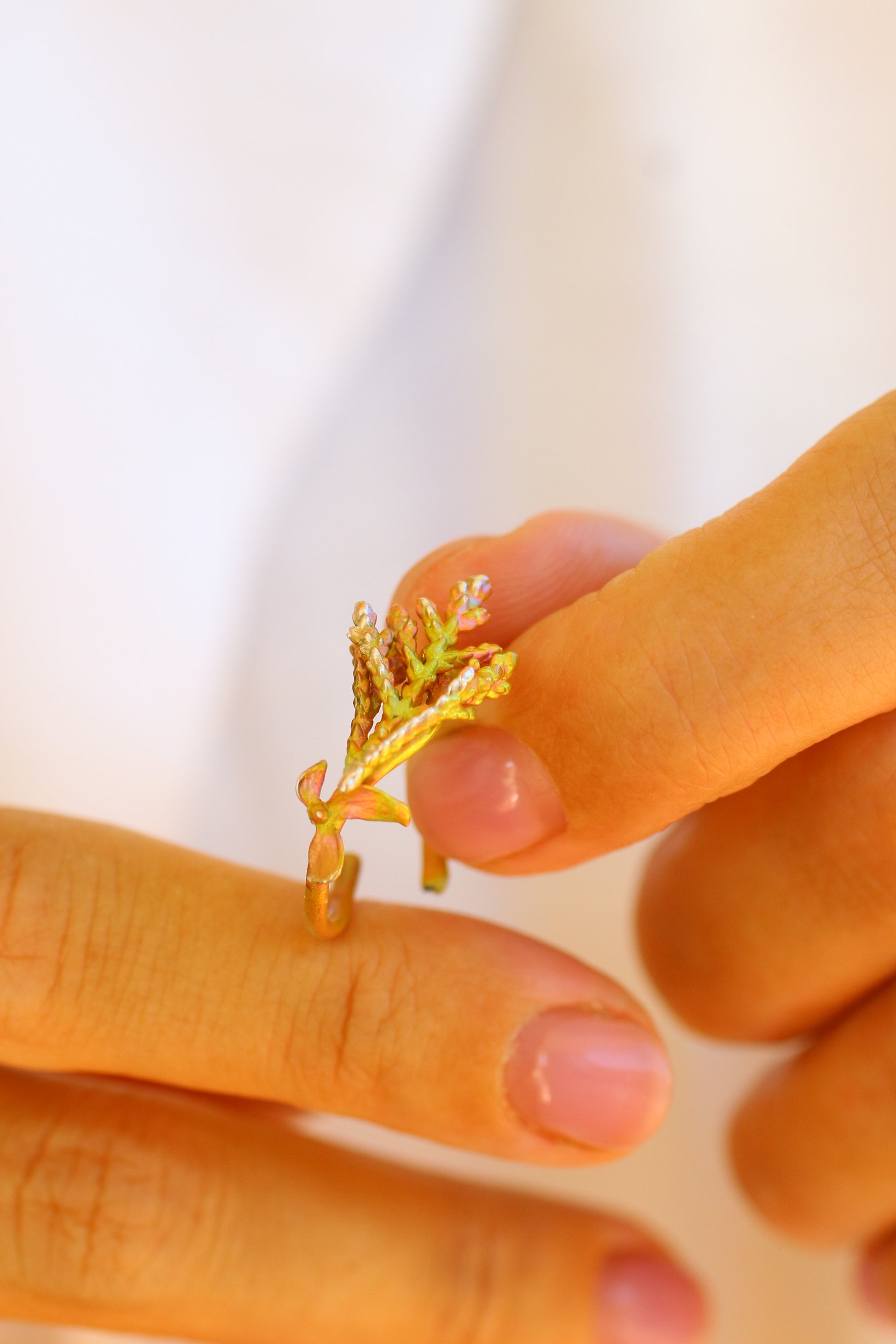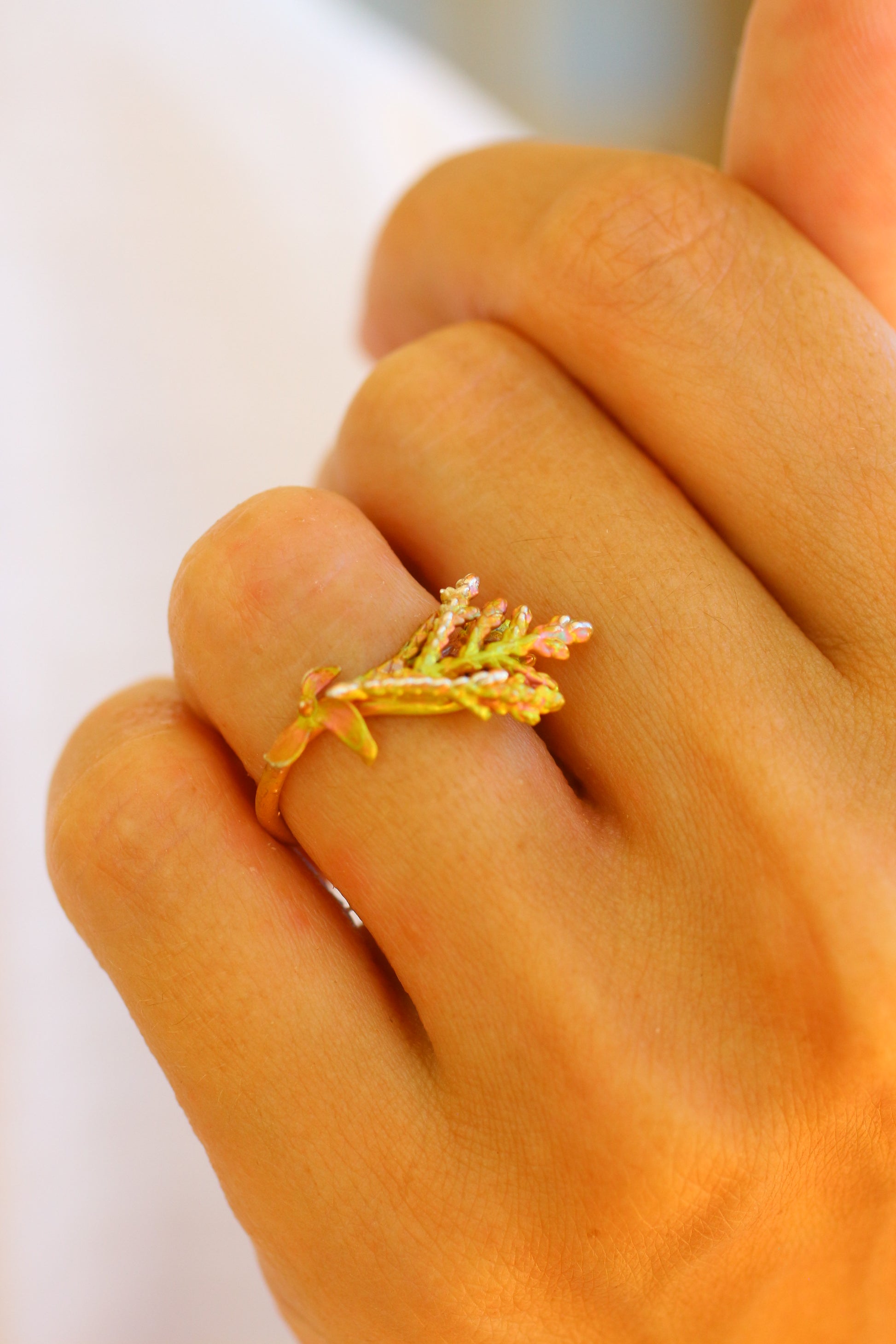 Anel com flor de hortênsia e ramo de tuia em prata colorida. Tamanho ajustável.