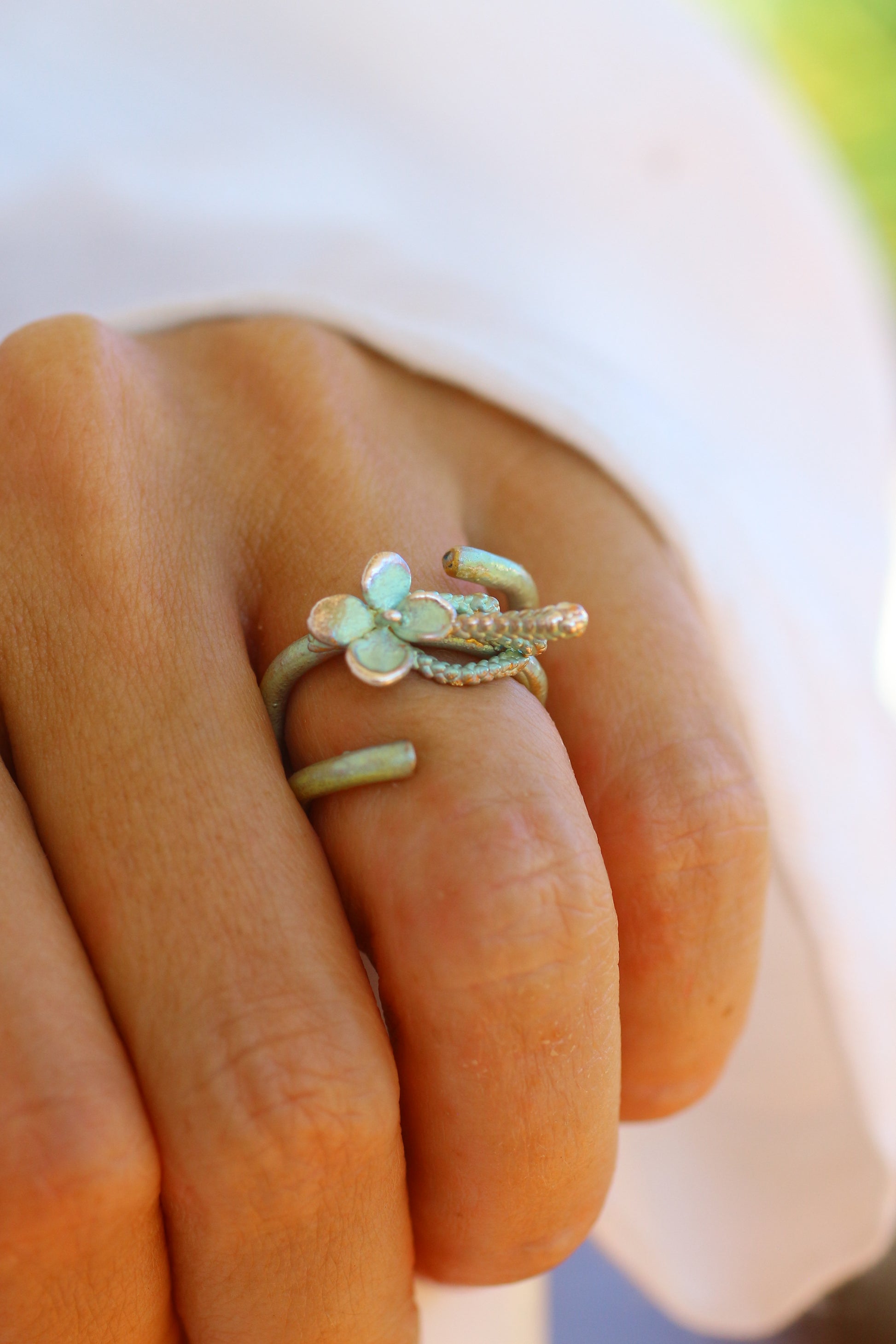 Anel com flor de hortênsia e ramo de tuia em prata colorida. Tamanho ajustável.