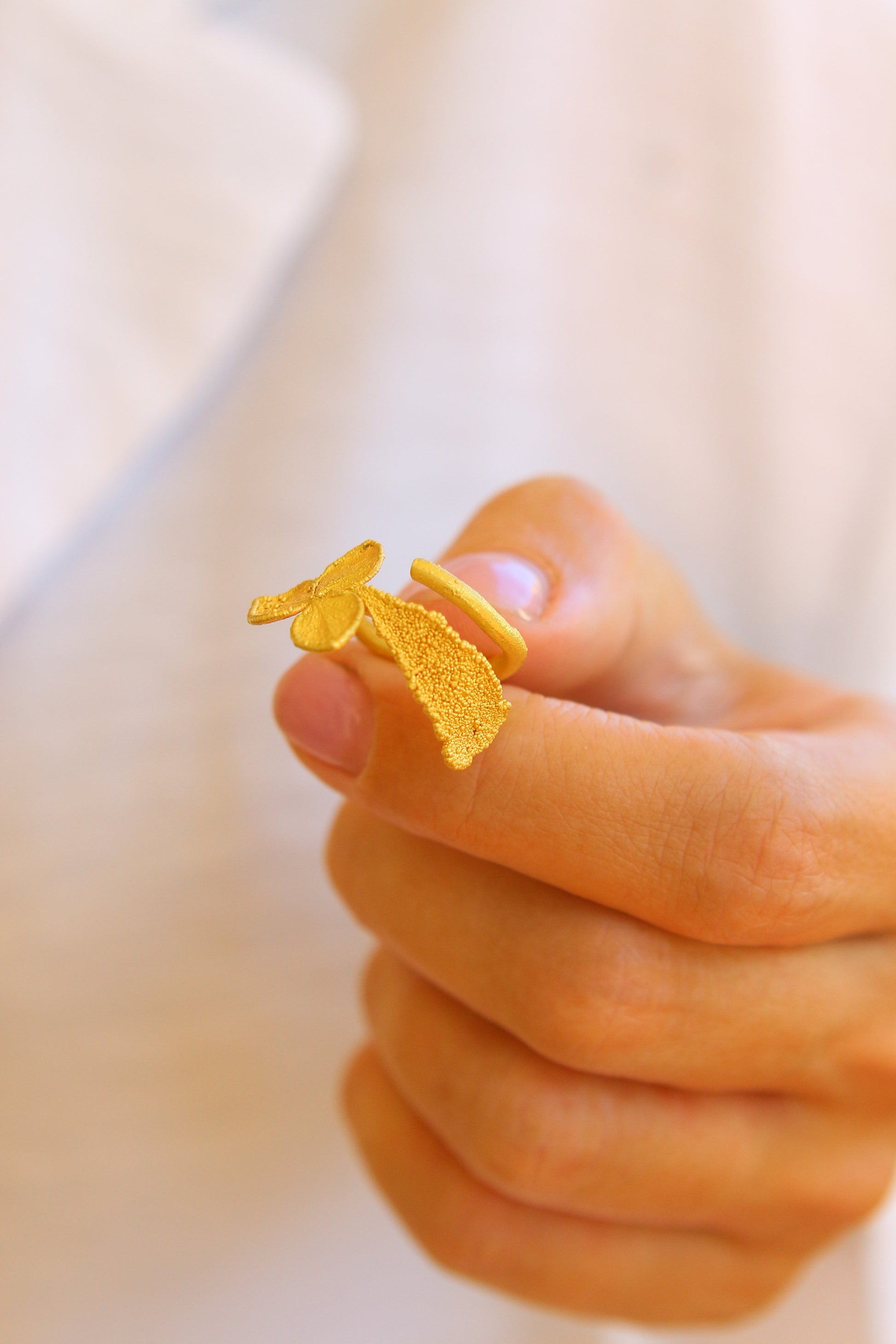 Anel com flor de hortênsia em ouro. Tamanho ajustável.