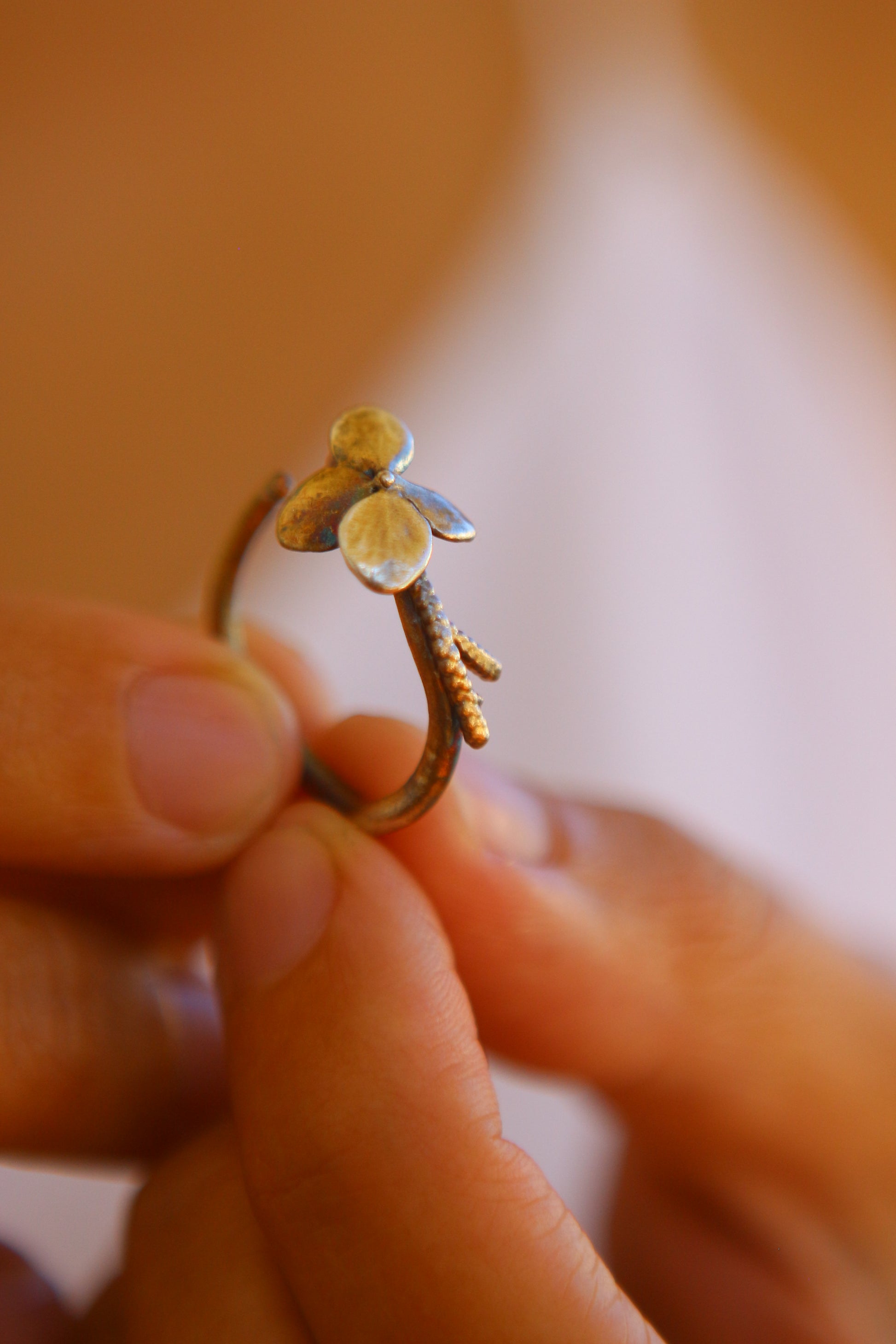 Anel com flor de hortensia e ramo de tuia em prata colorida. Tamanho ajustável.