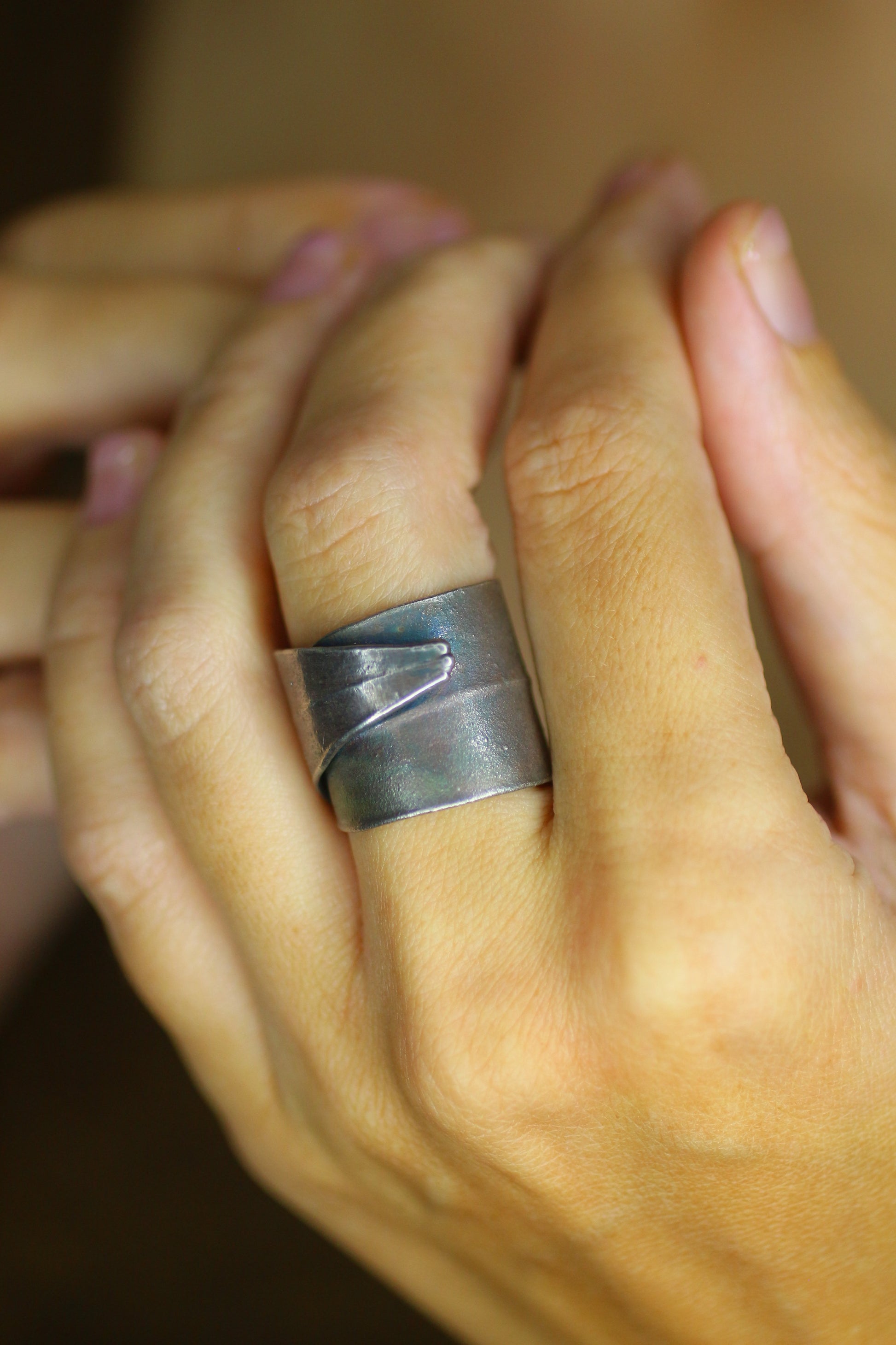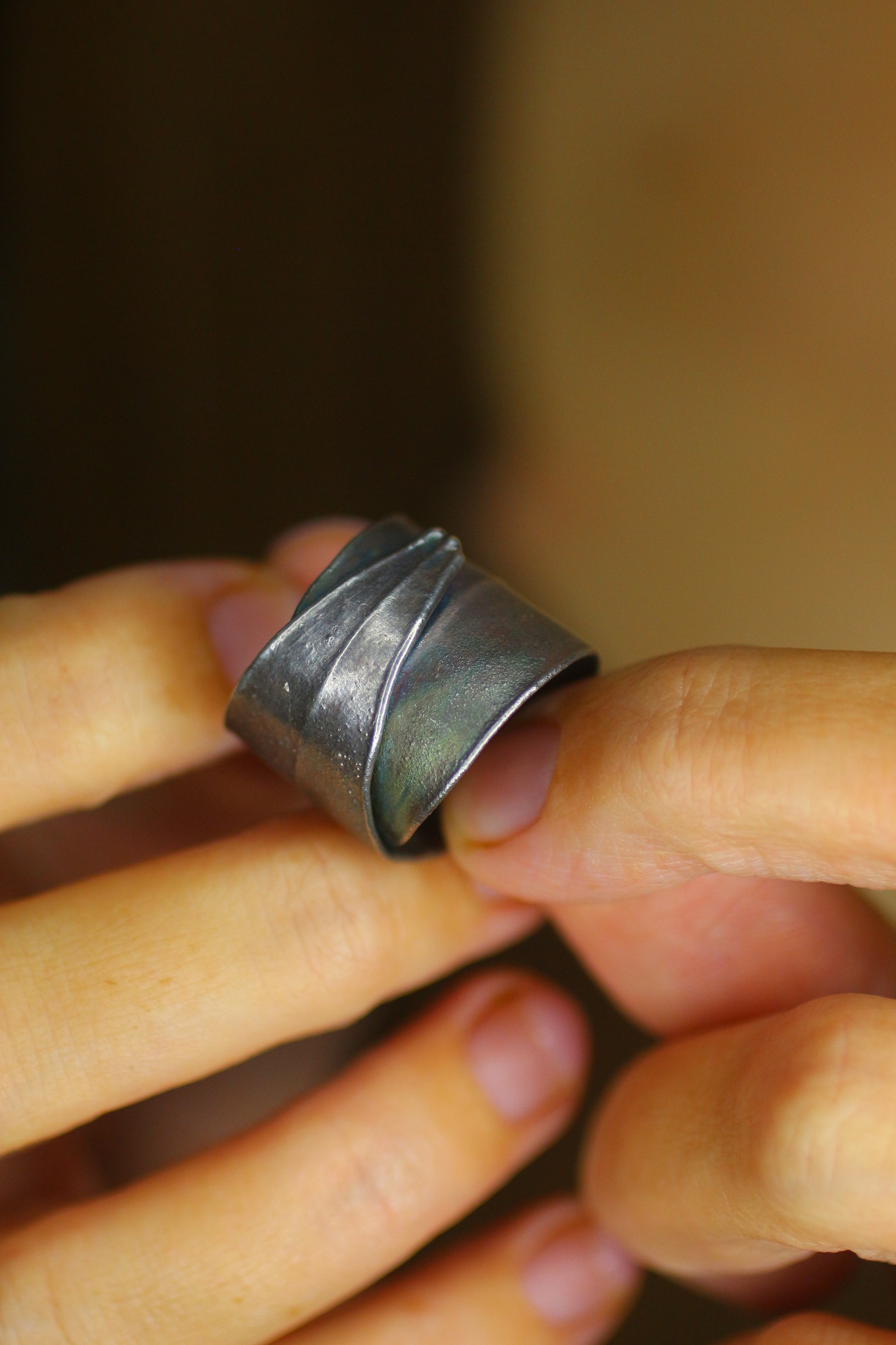 Anel com folha de árvore-de-ferro em prata colorida. Tamanho ajustável.