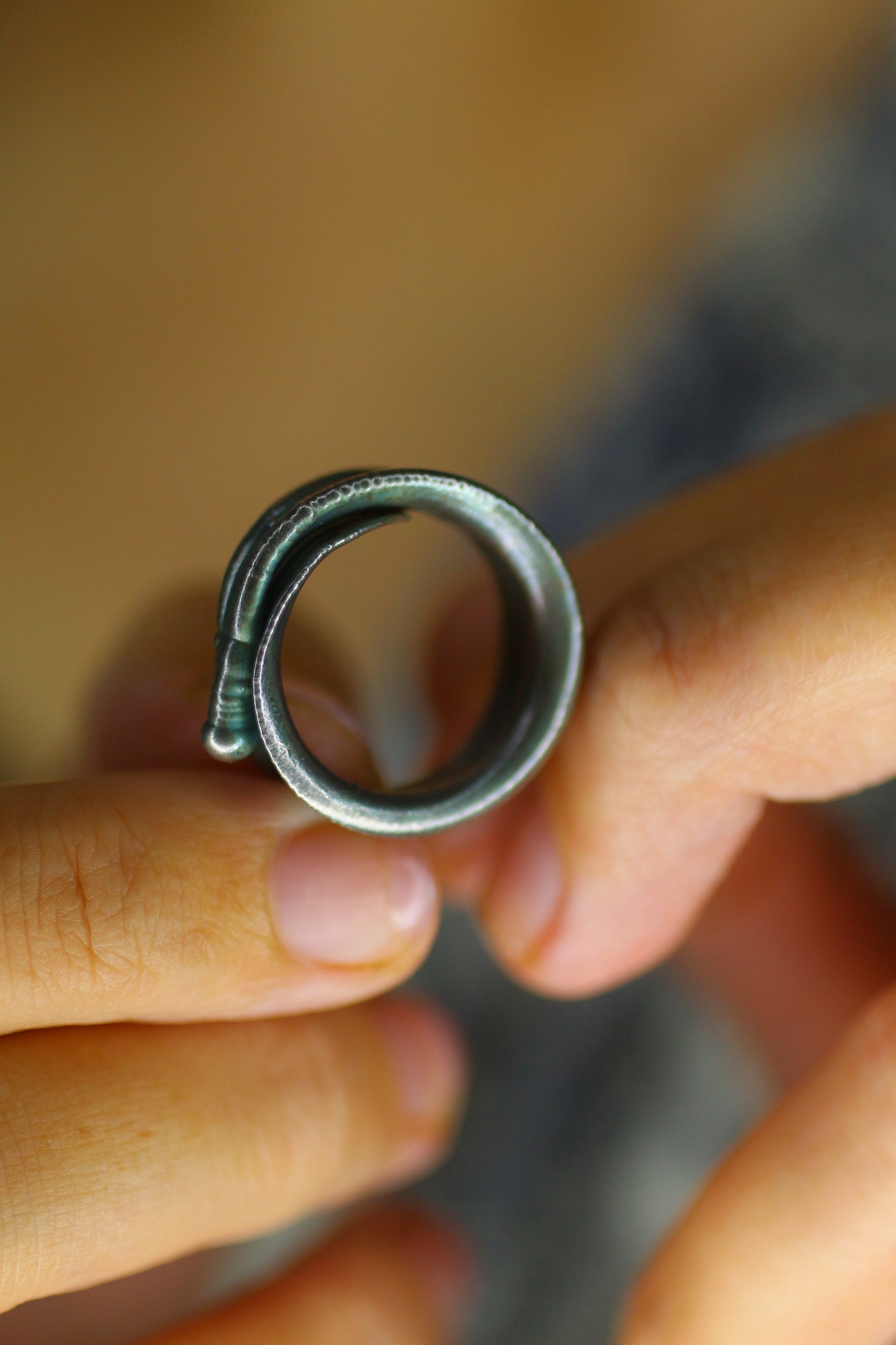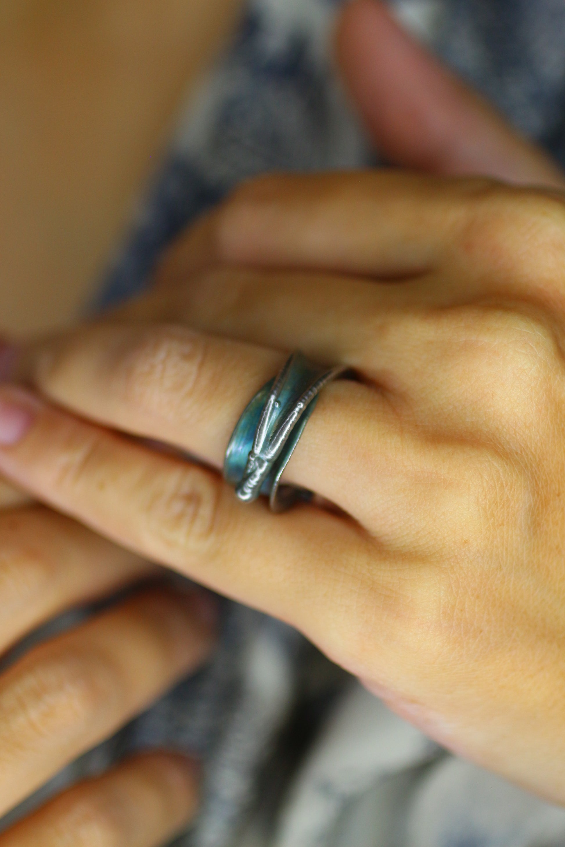 Anel com folha de bambu em prata colorida. Tamanho ajustável.