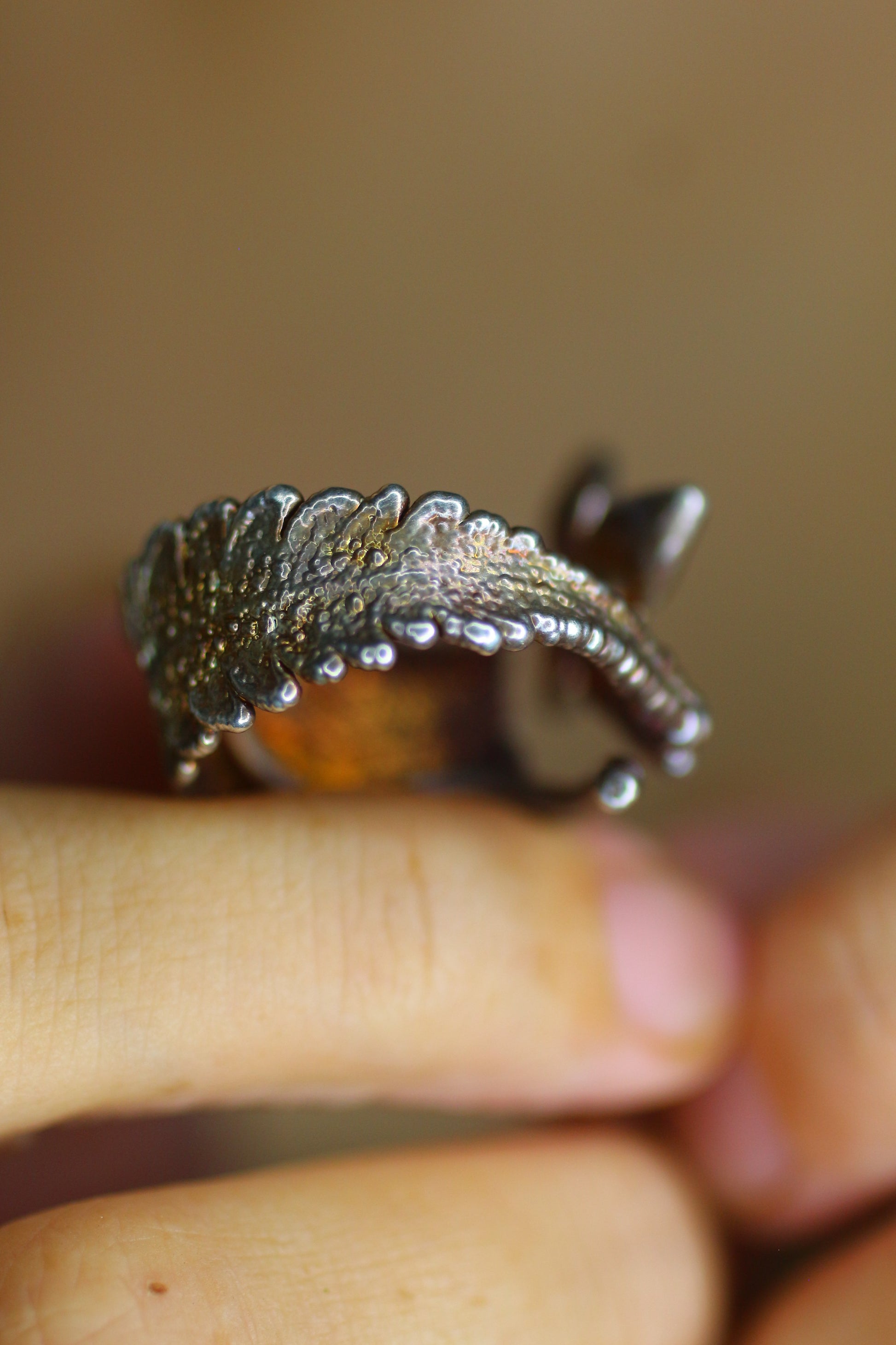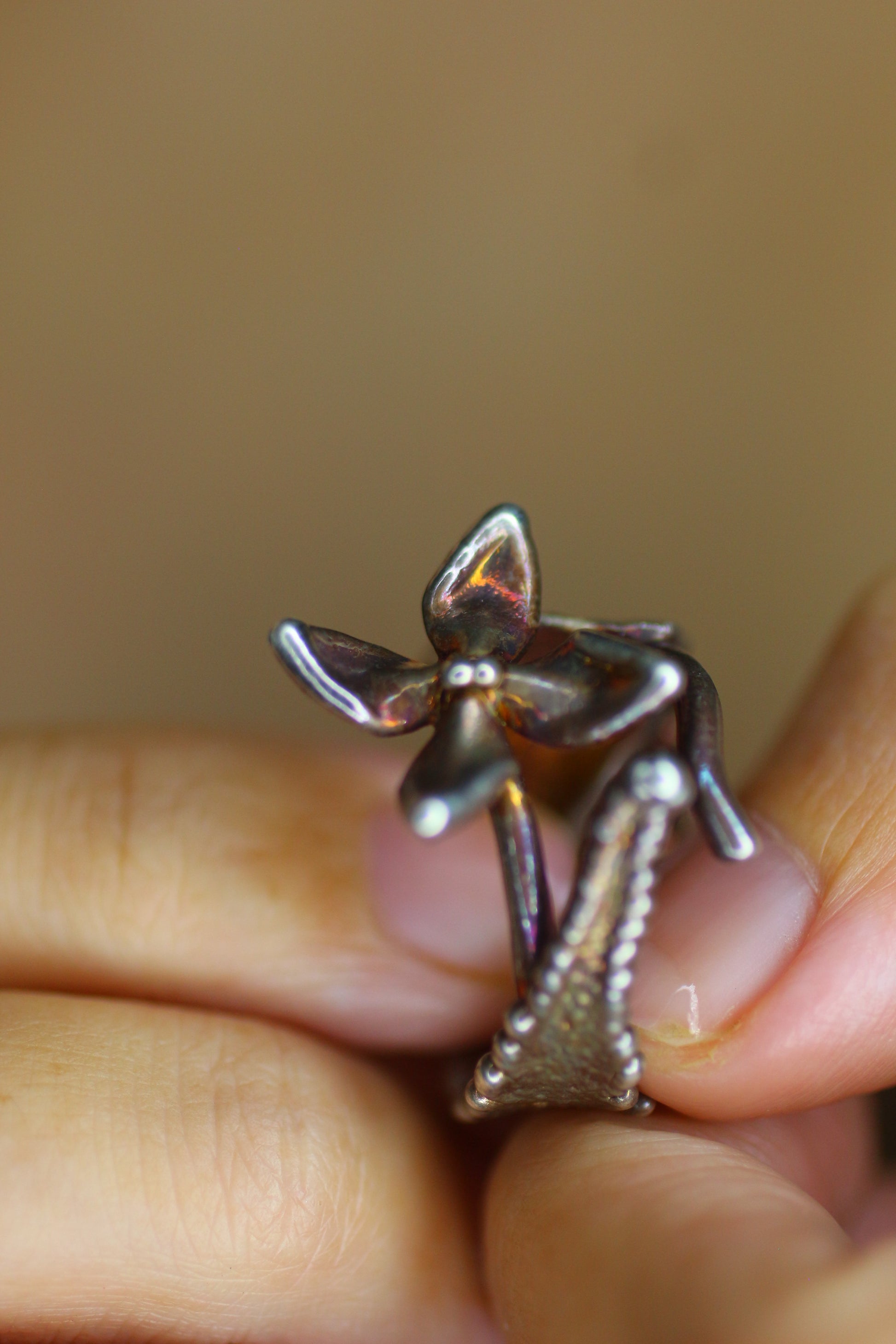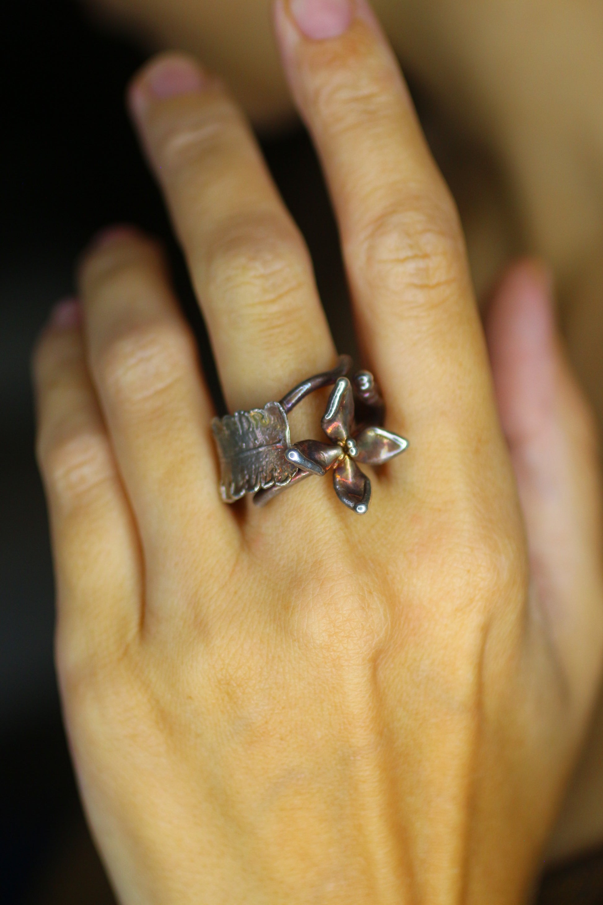 Anel com folha de feto e flor de ixora em prata colorida. Tamanho ajustável.