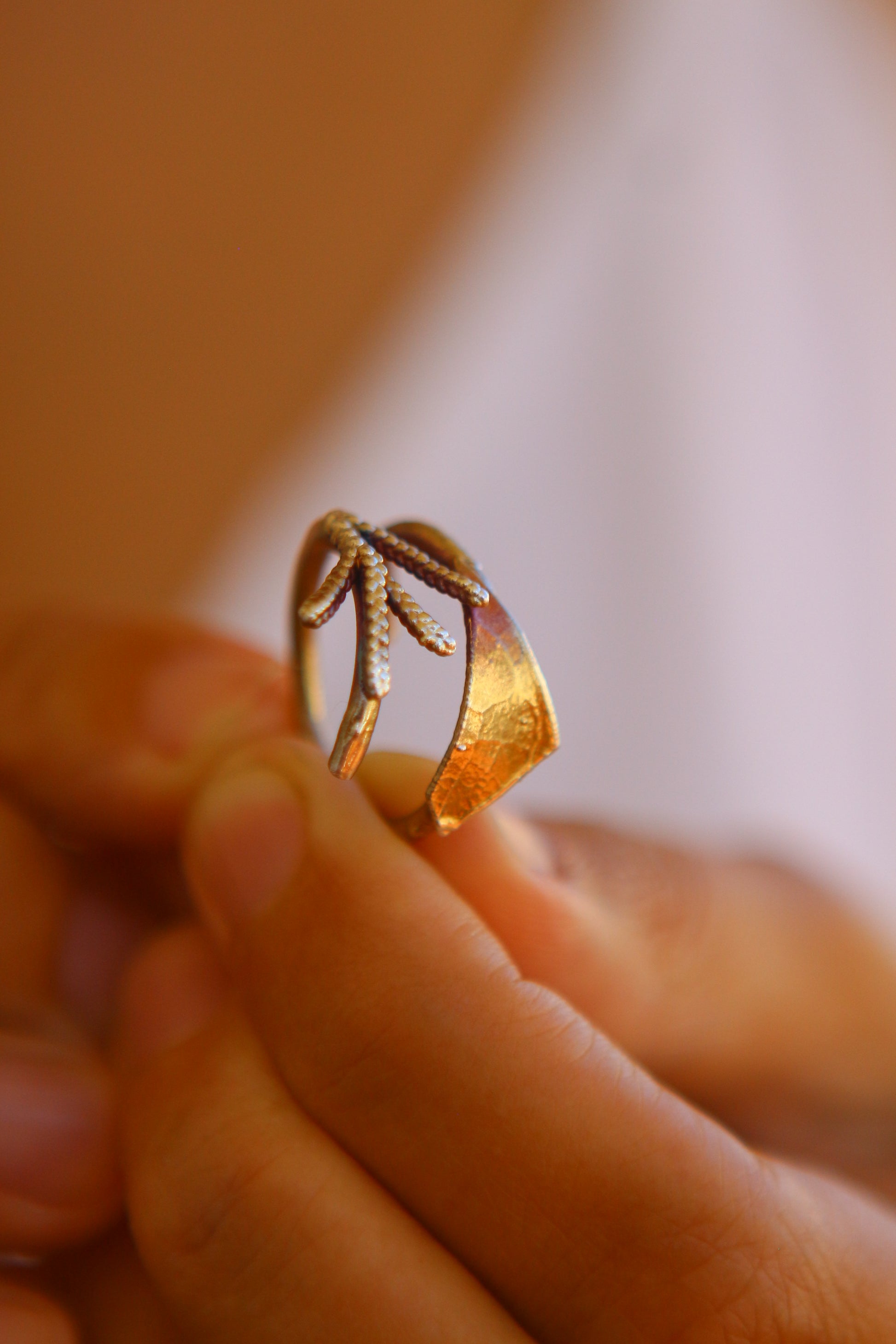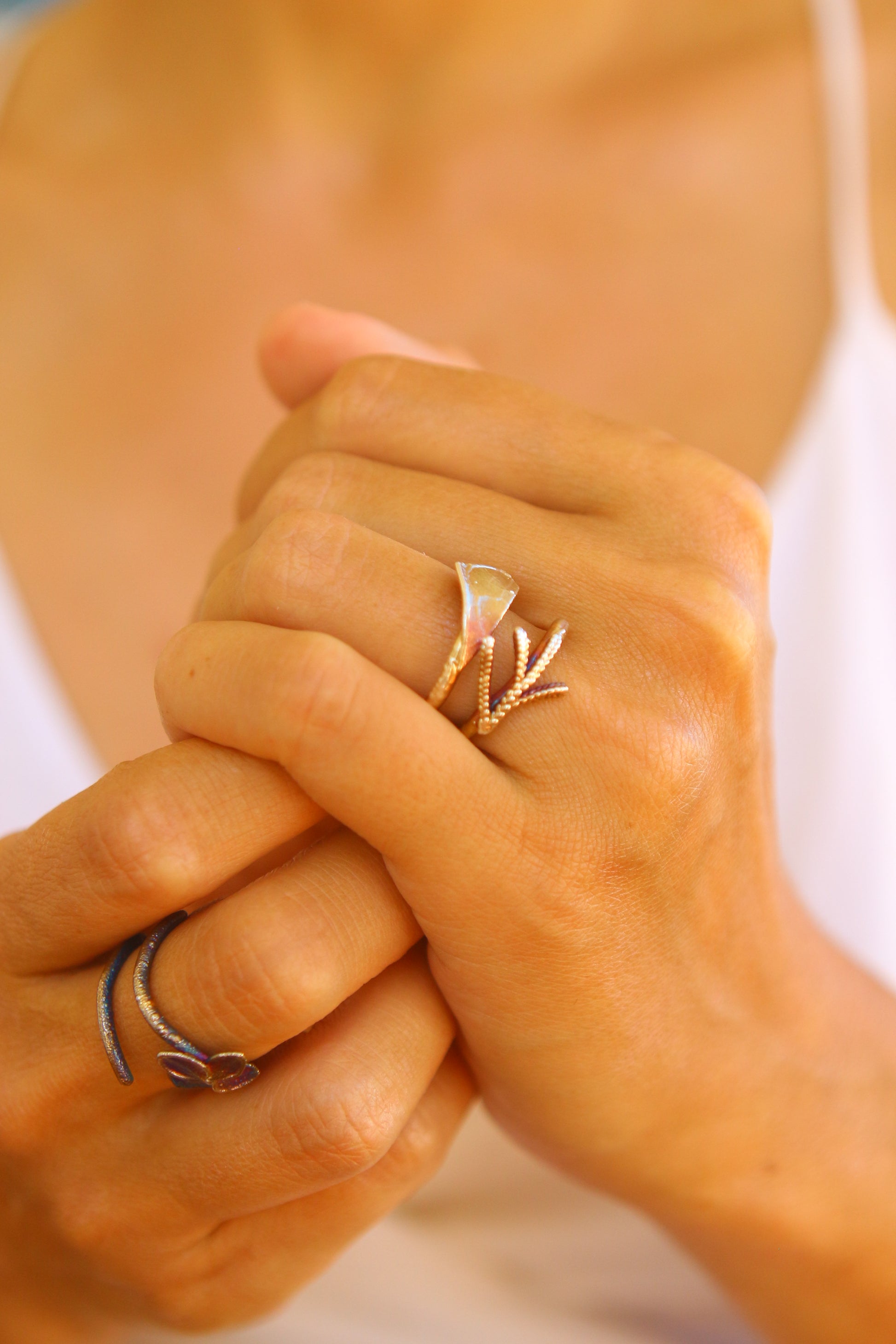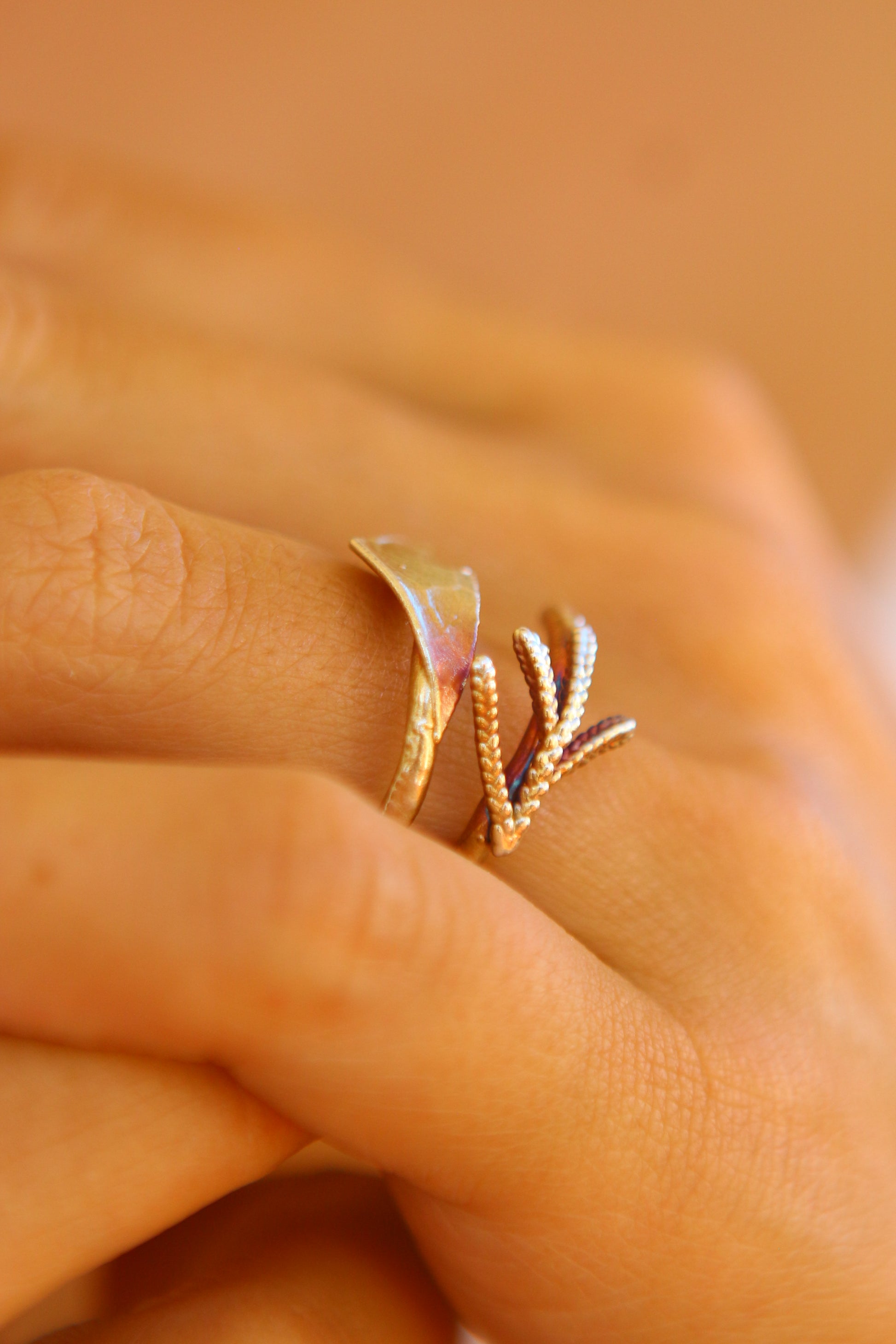 Anel com fragmento de folha e ramo de tuia em prata colorida. Tamanho ajustável.