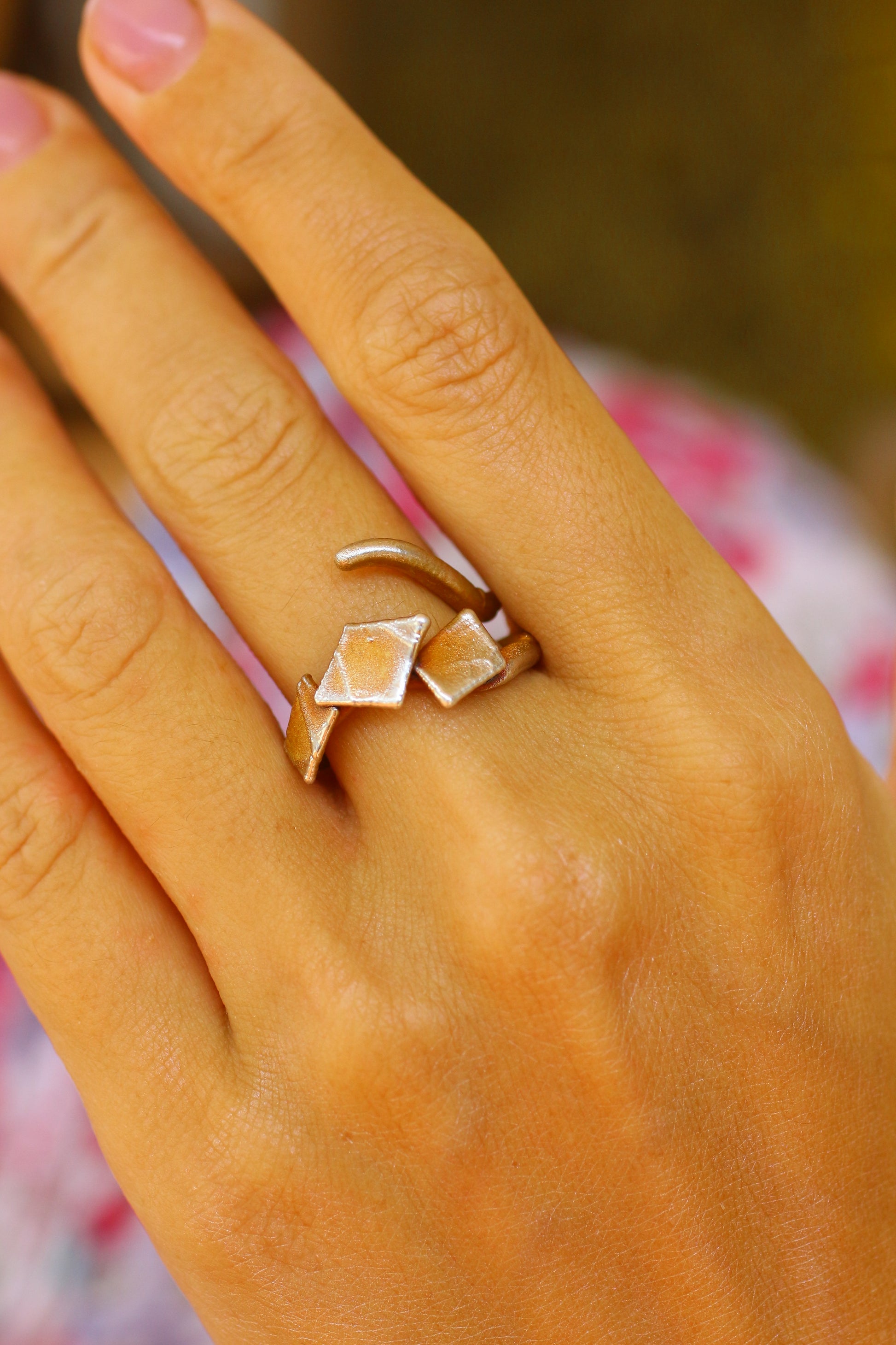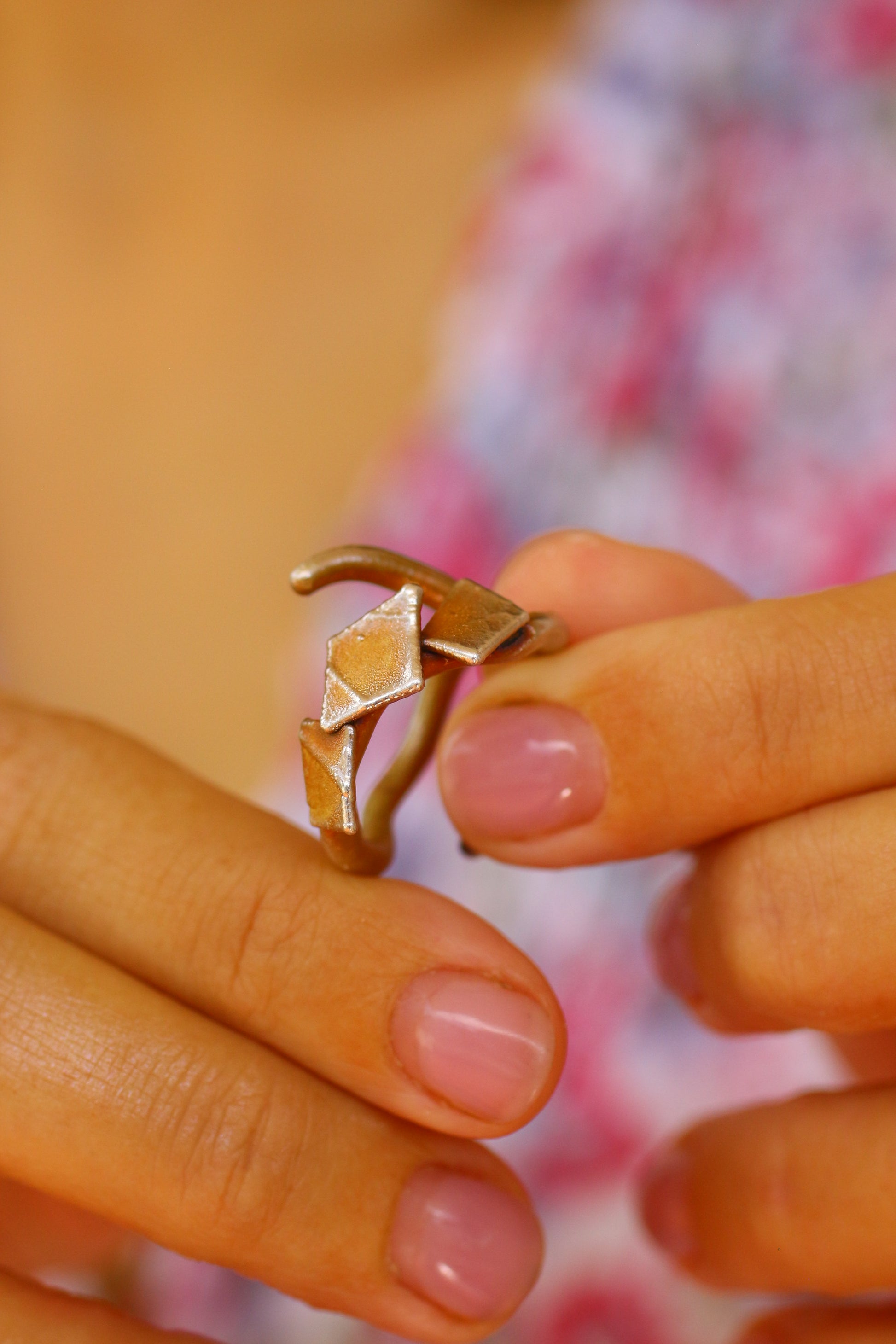 Anel com fragmento de folha em prata colorida. Tamanho ajustável.