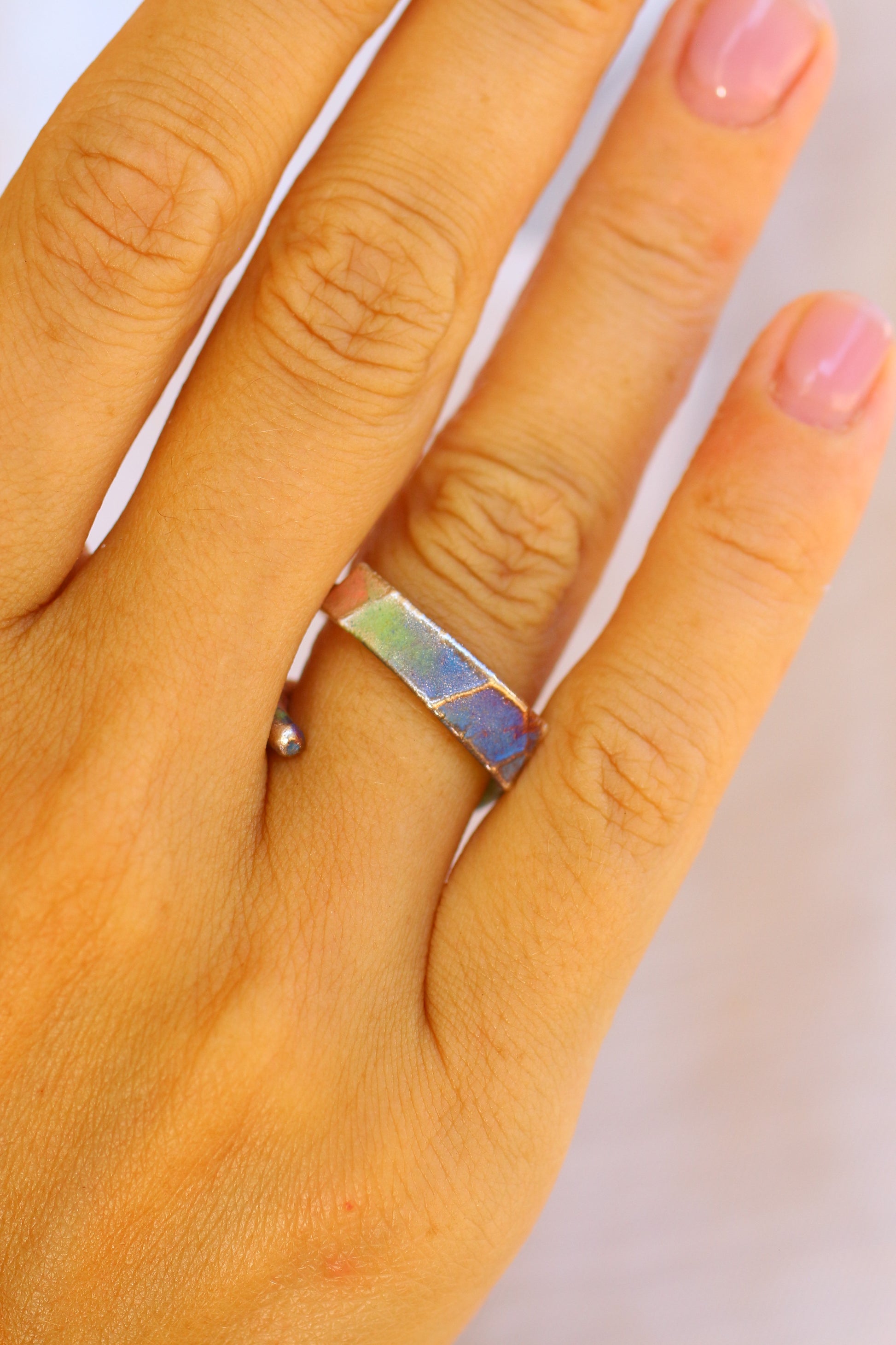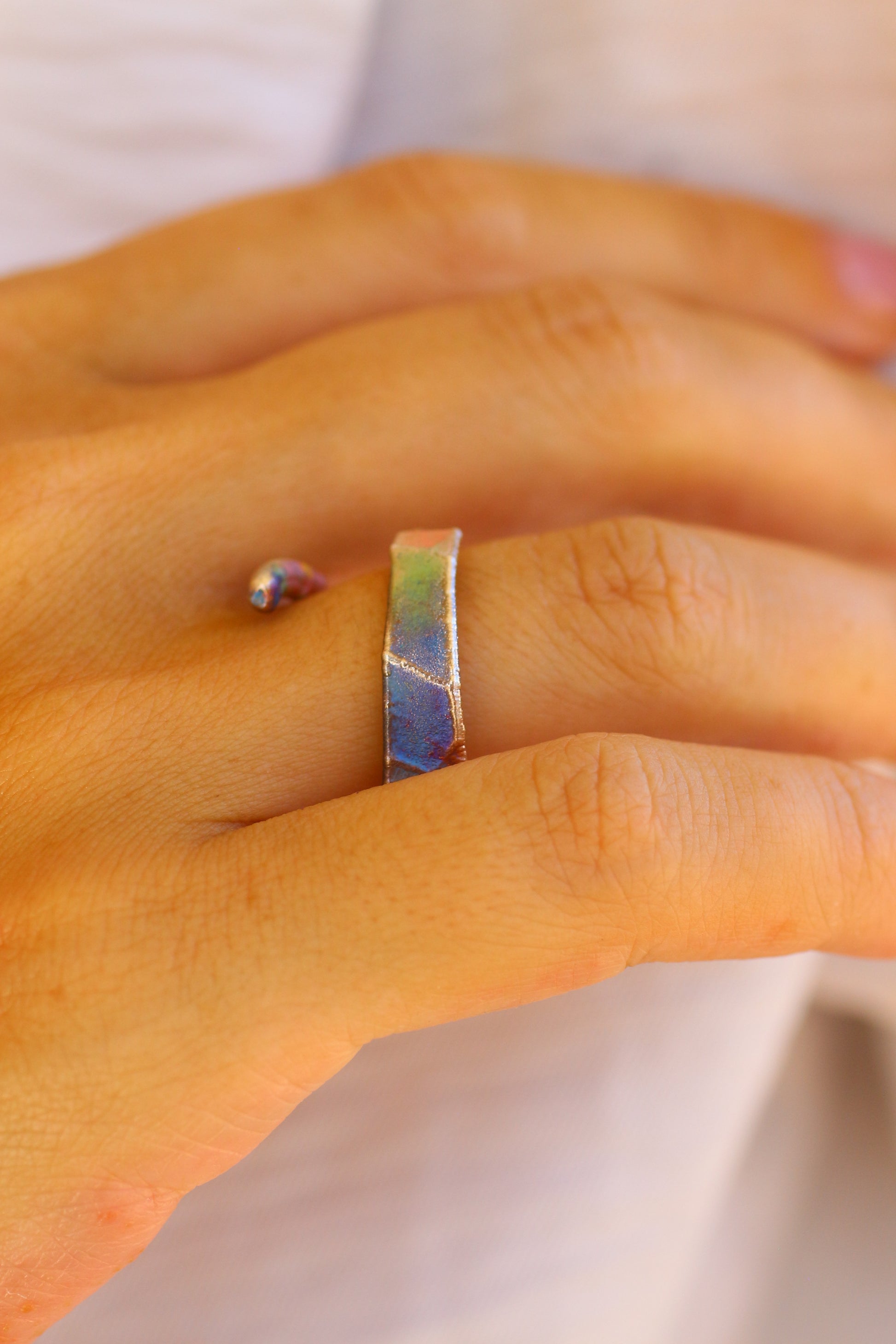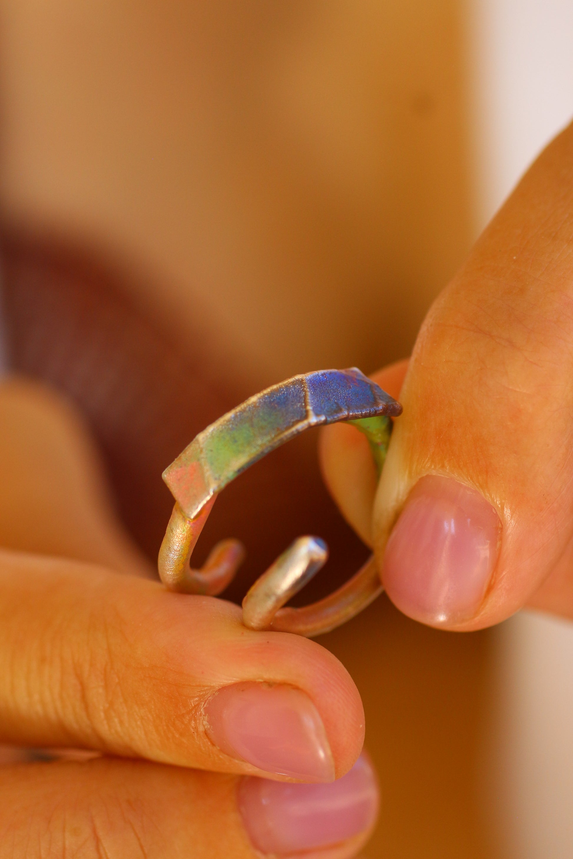 Anel com fragmento de folha em prata colorida. Tamanho ajustável.