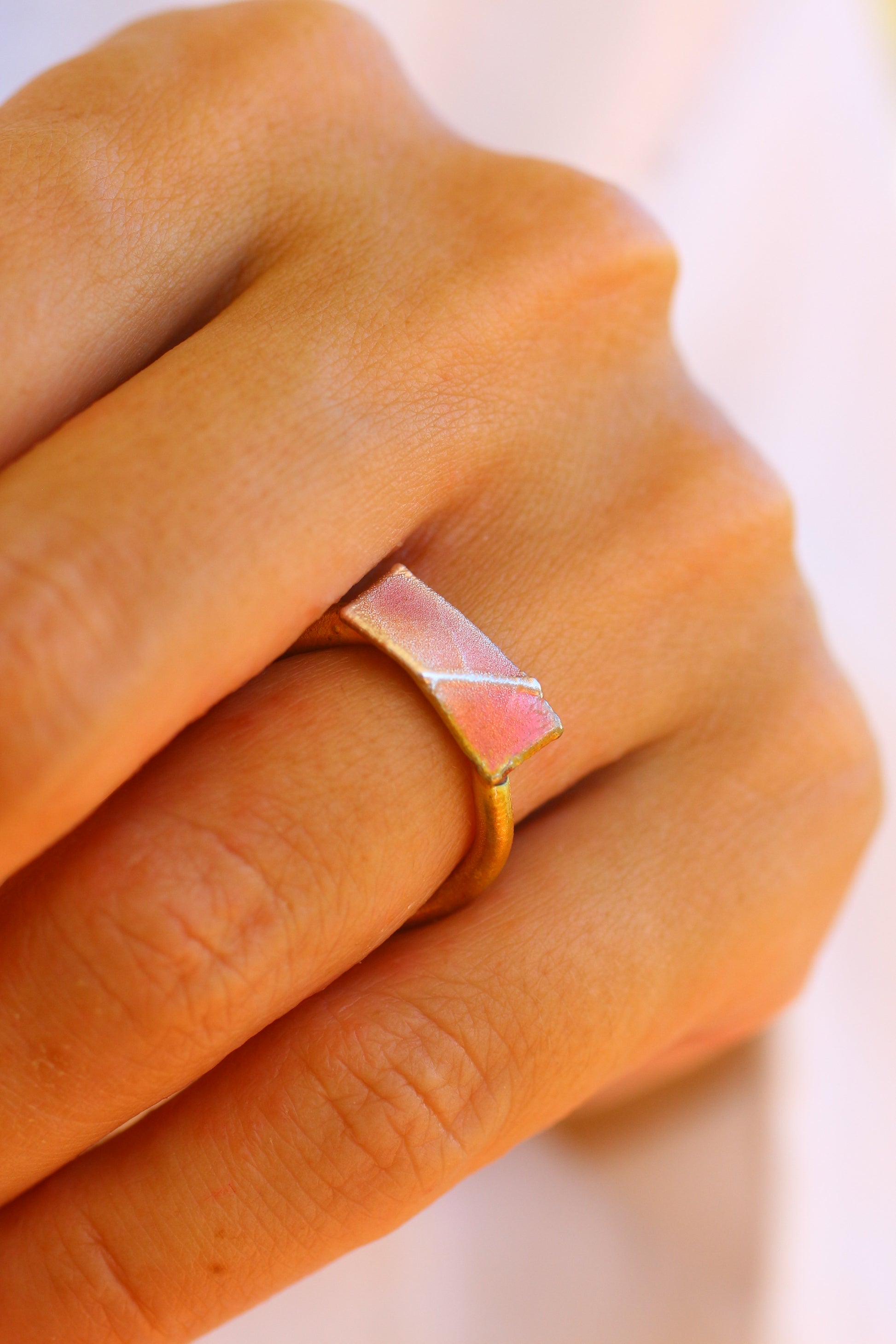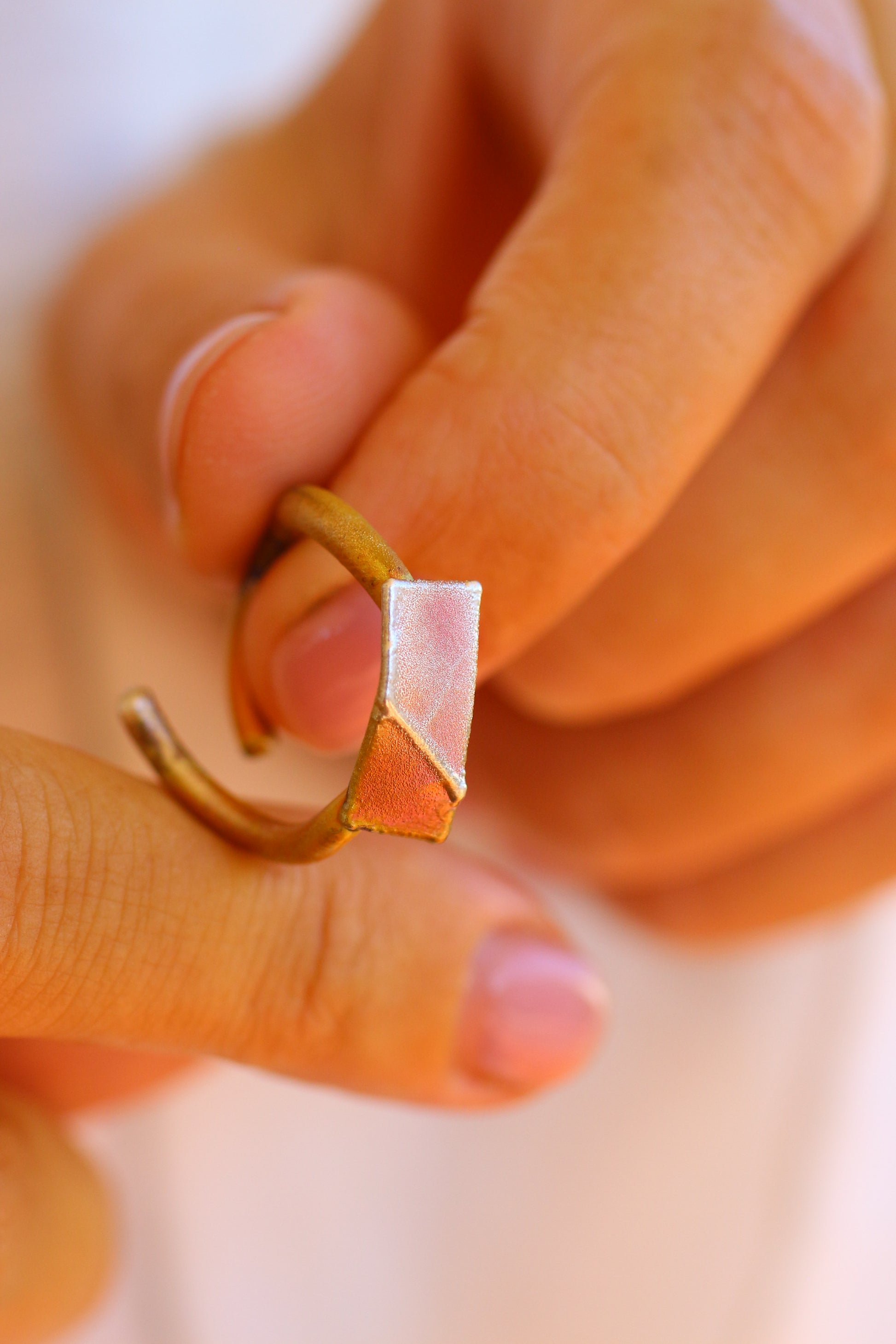 Anel com fragmento de folha em prata colorida. Tamanho ajustável.