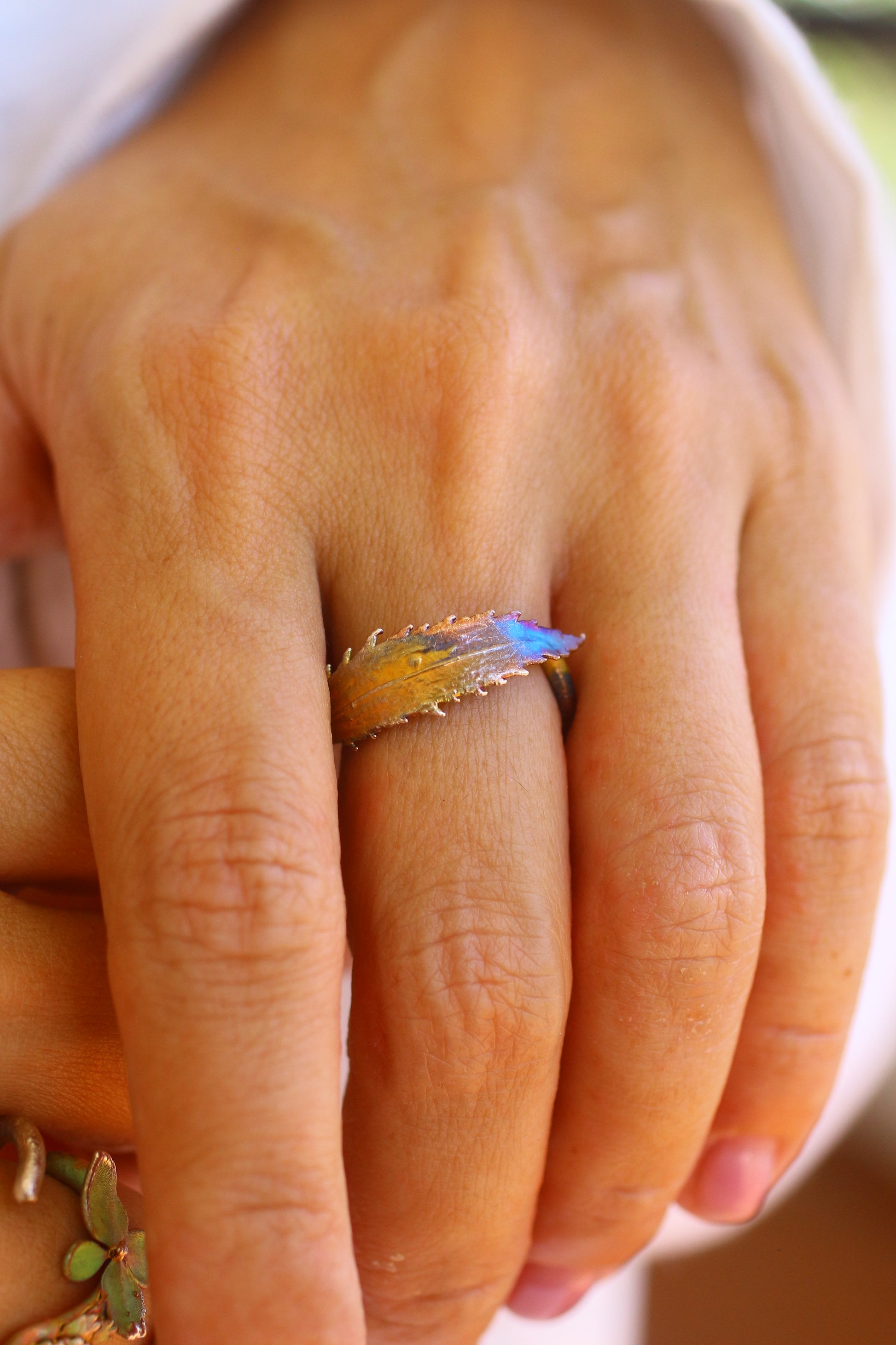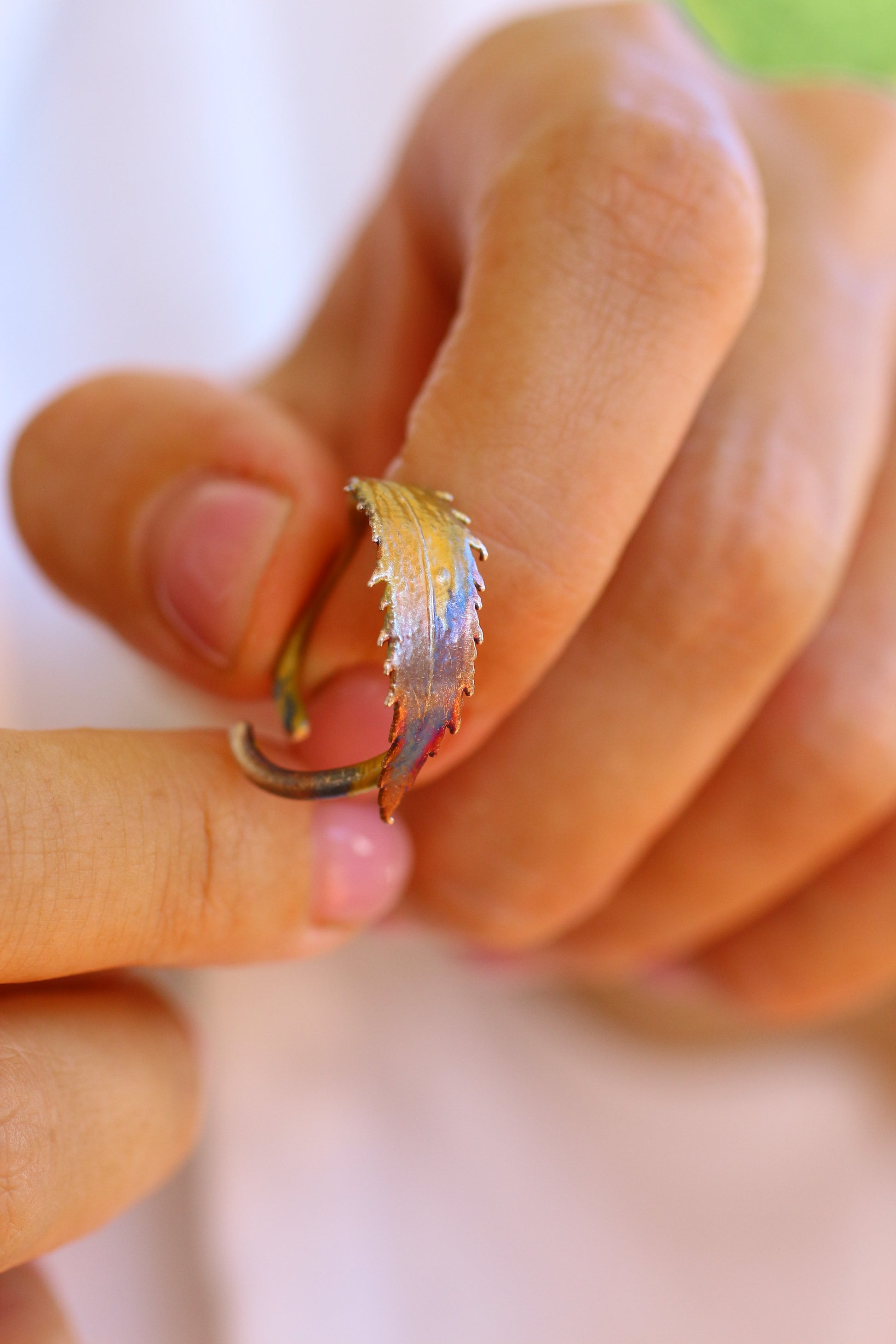 Anel com folha de tagetes em prata colorida. Tamanho ajustável.