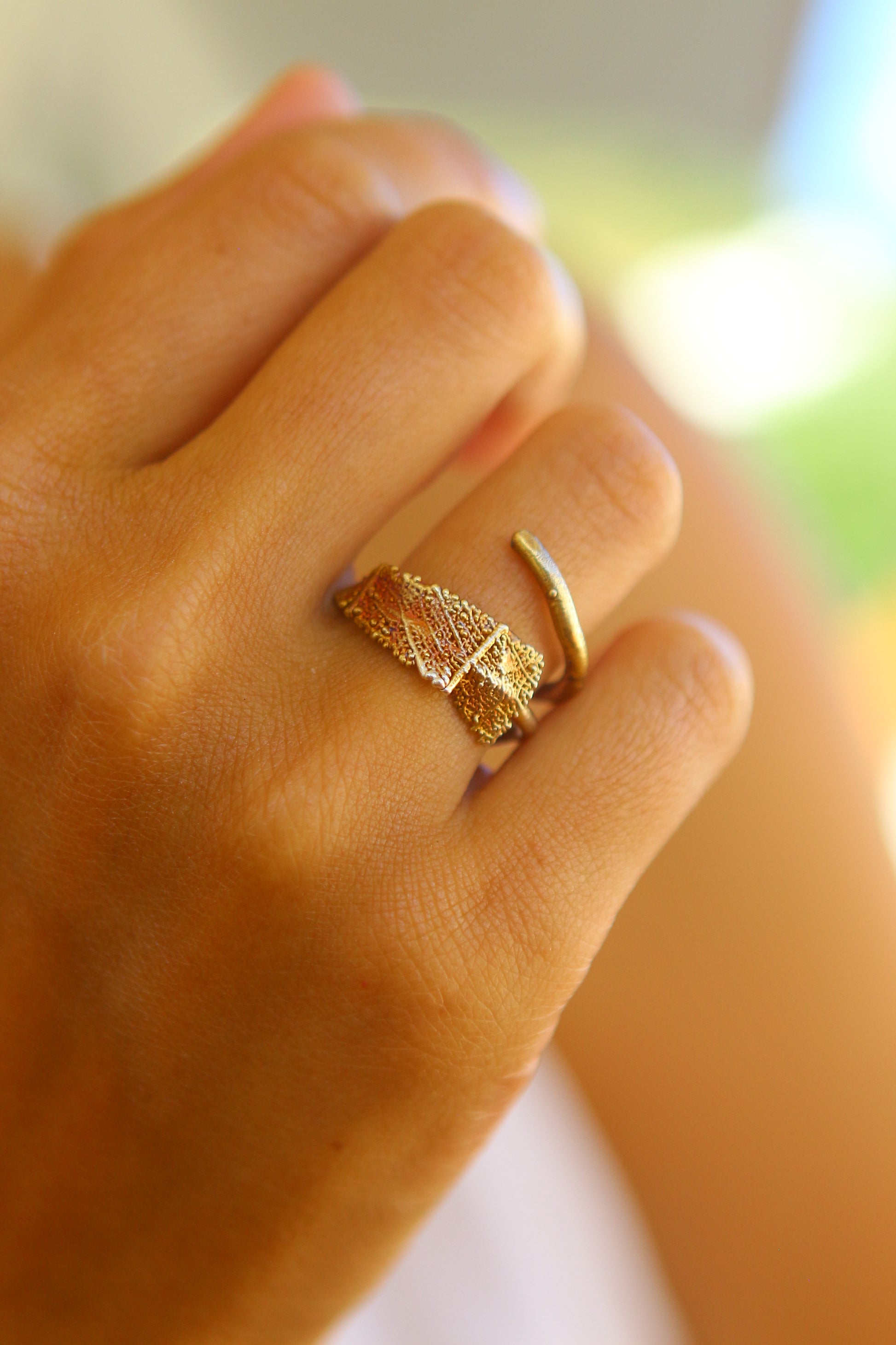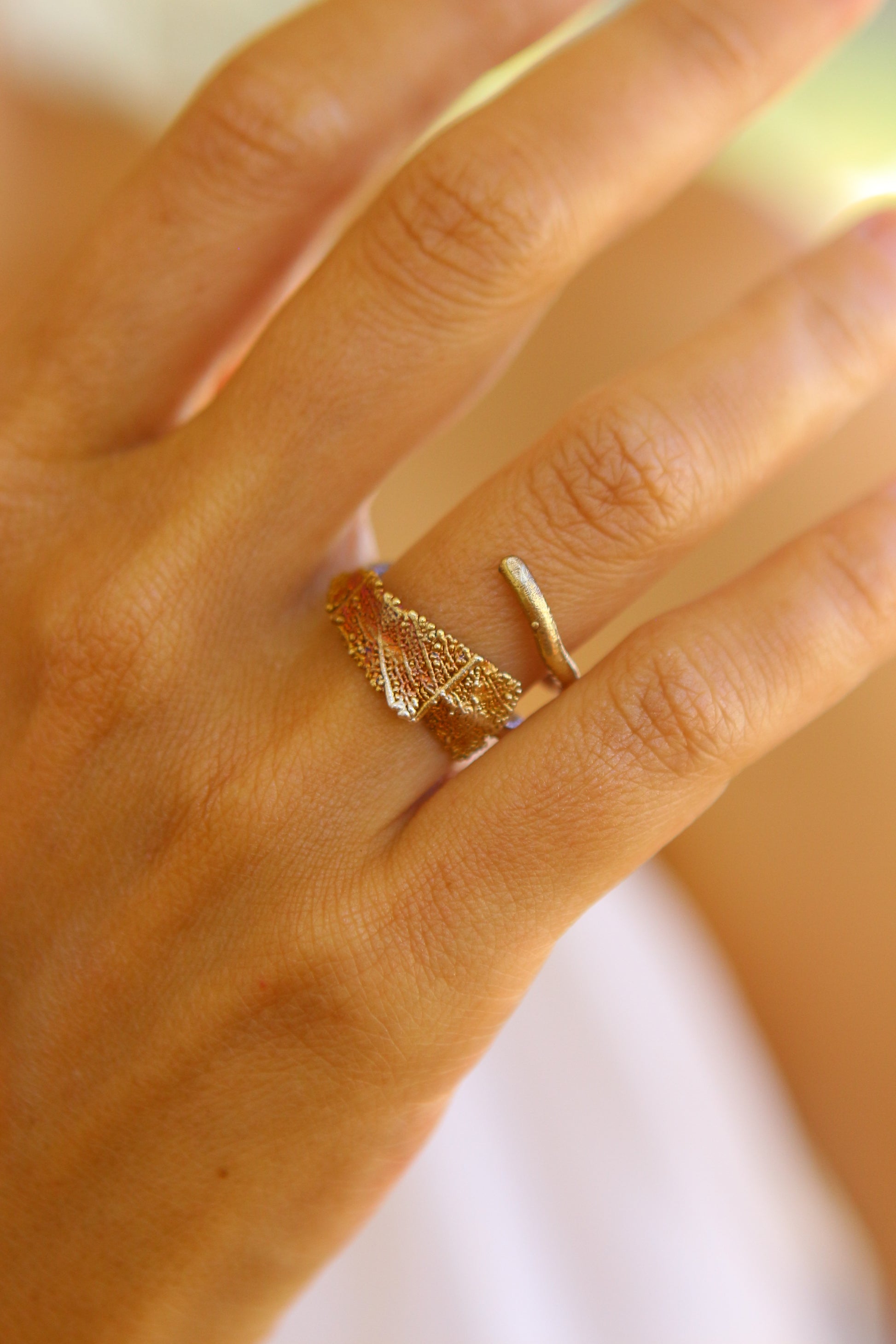 Anel com fragmento de folha em prata colorida. Tamanho ajustável.