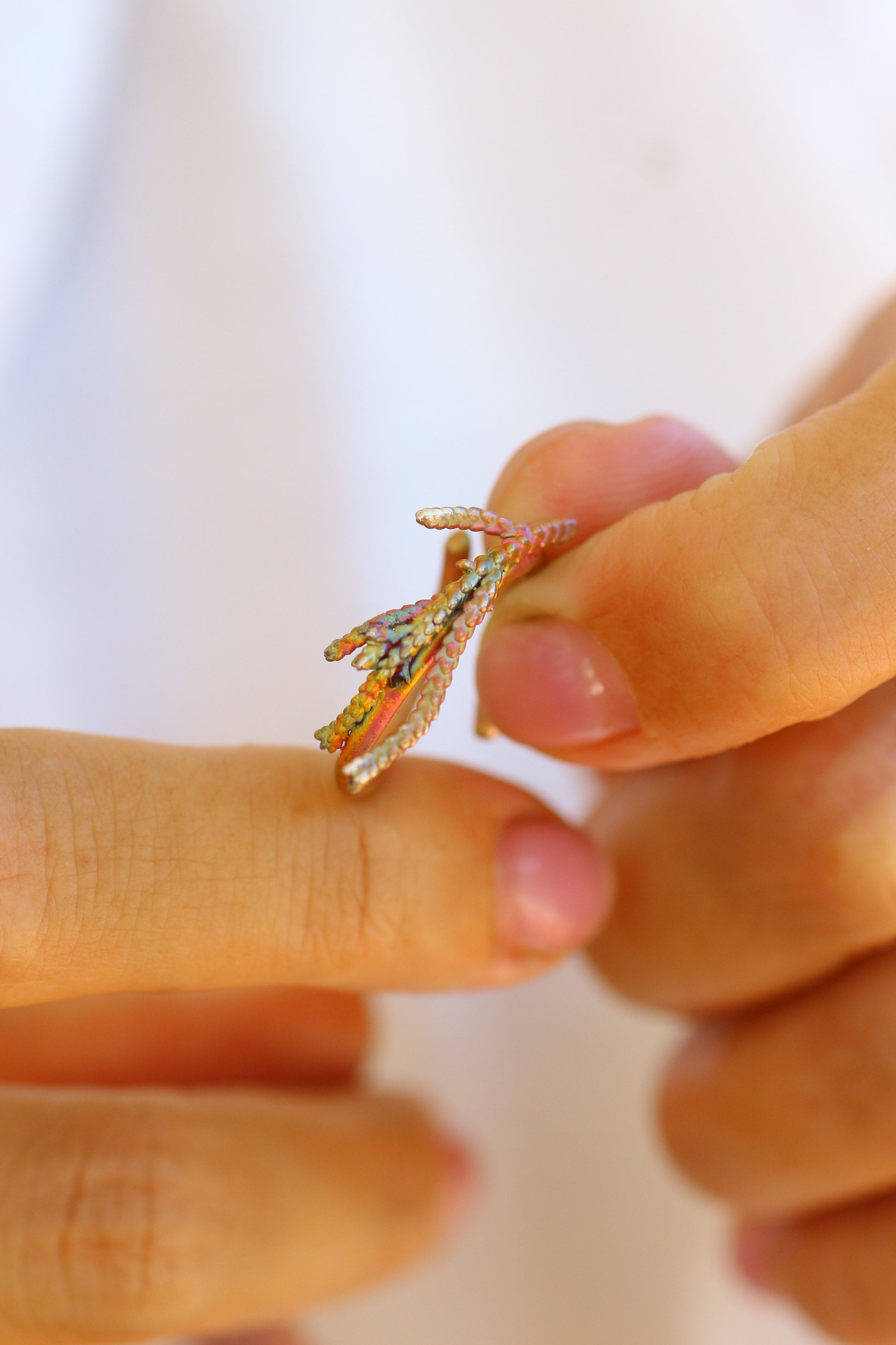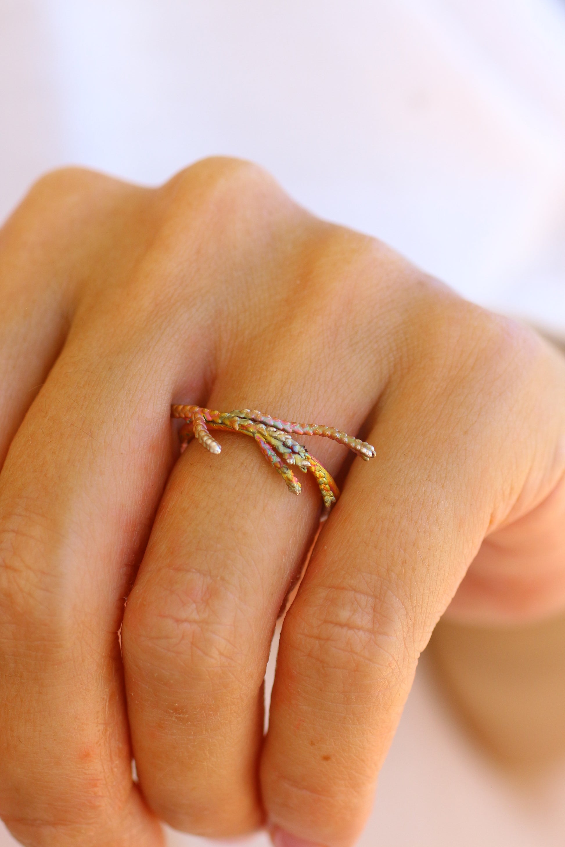 Anel com ramos de tuia em prata colorida. Tamanho ajustável.
