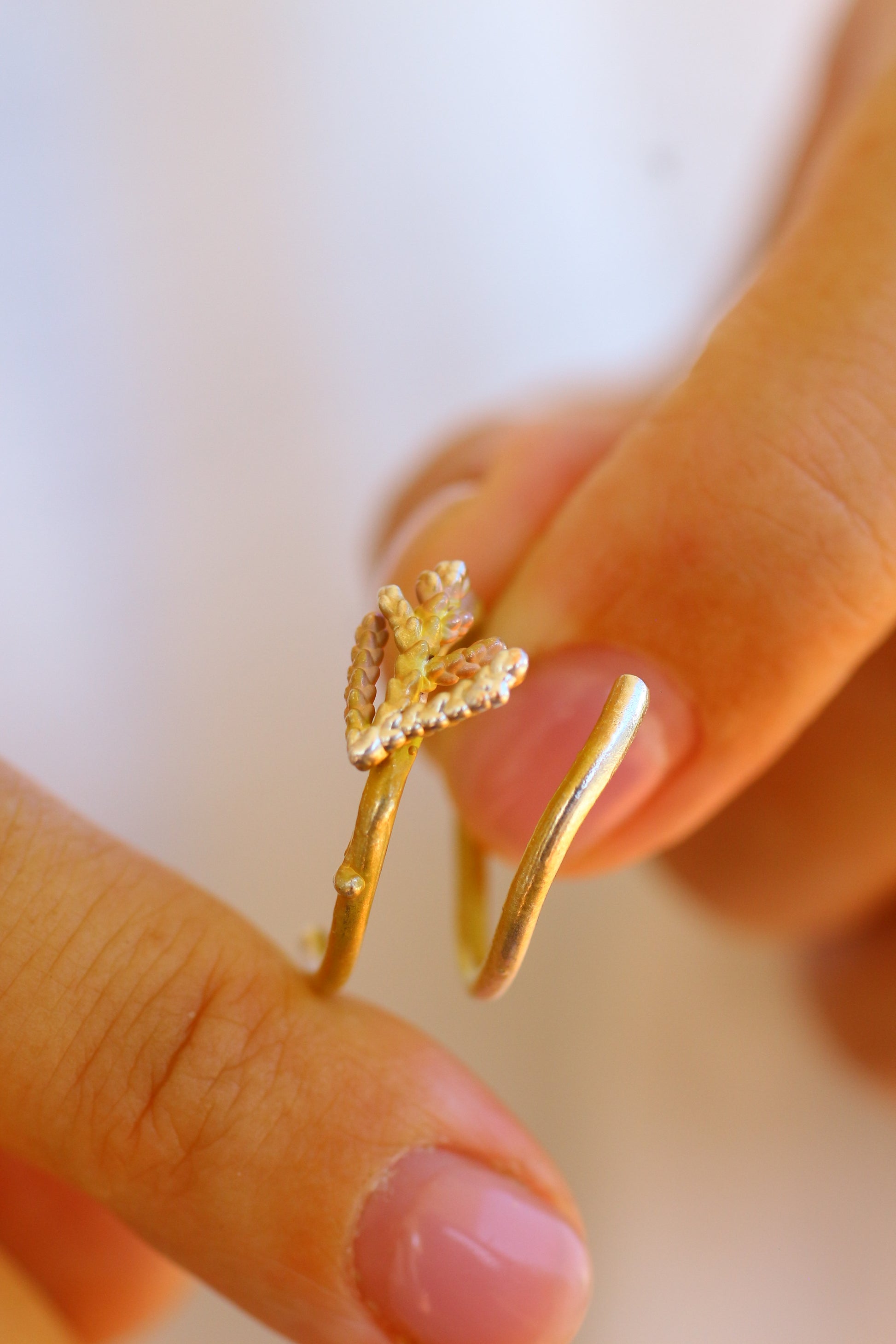 Anel com ramos de tuia em prata colorida. Tamanho ajustável.