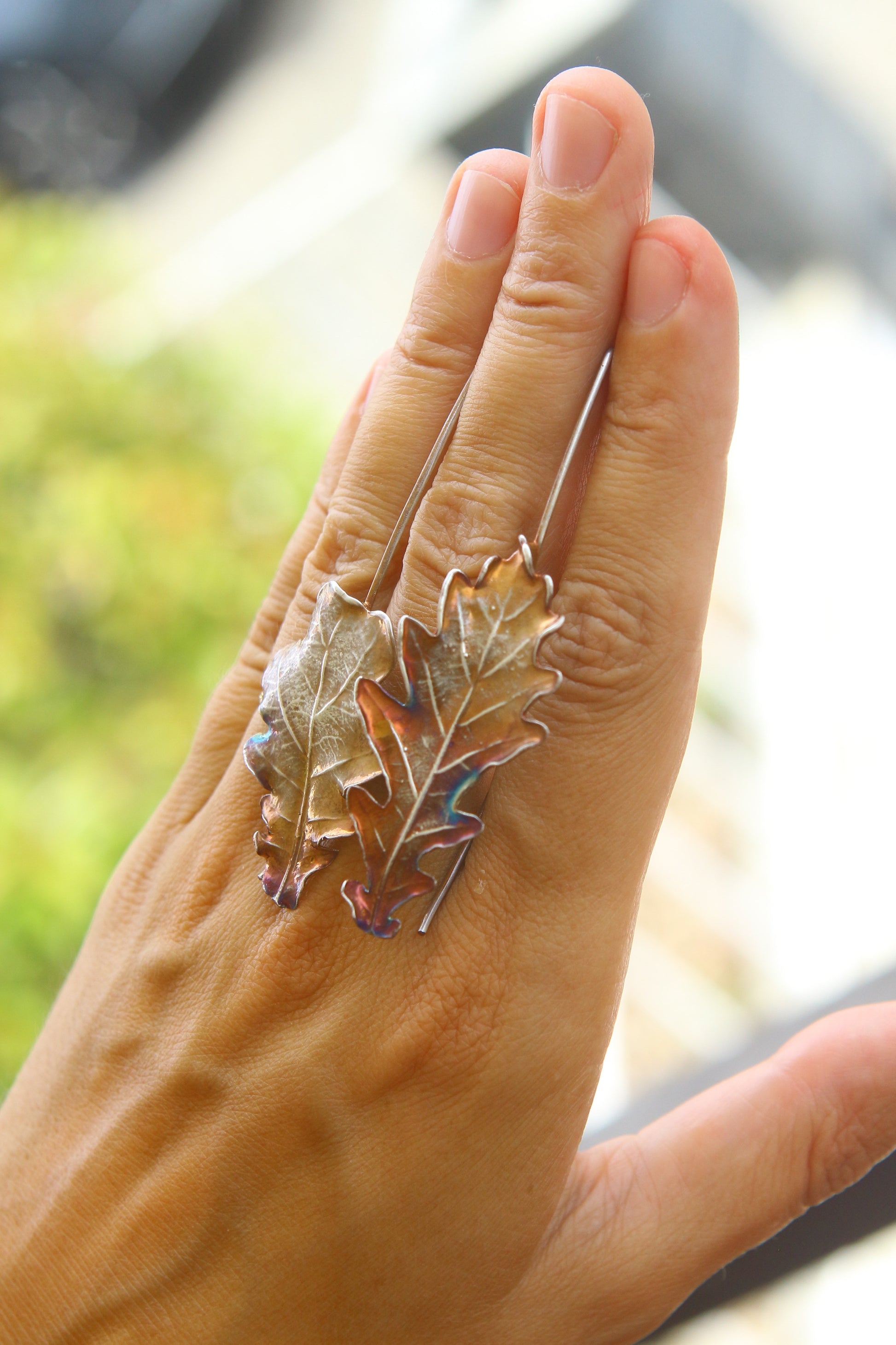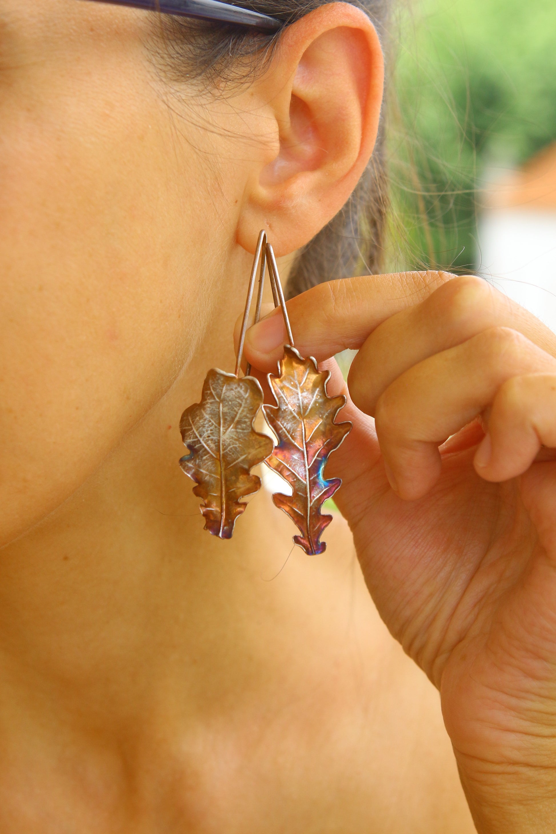 Brincos com folhas de carvalho em prata colorida.