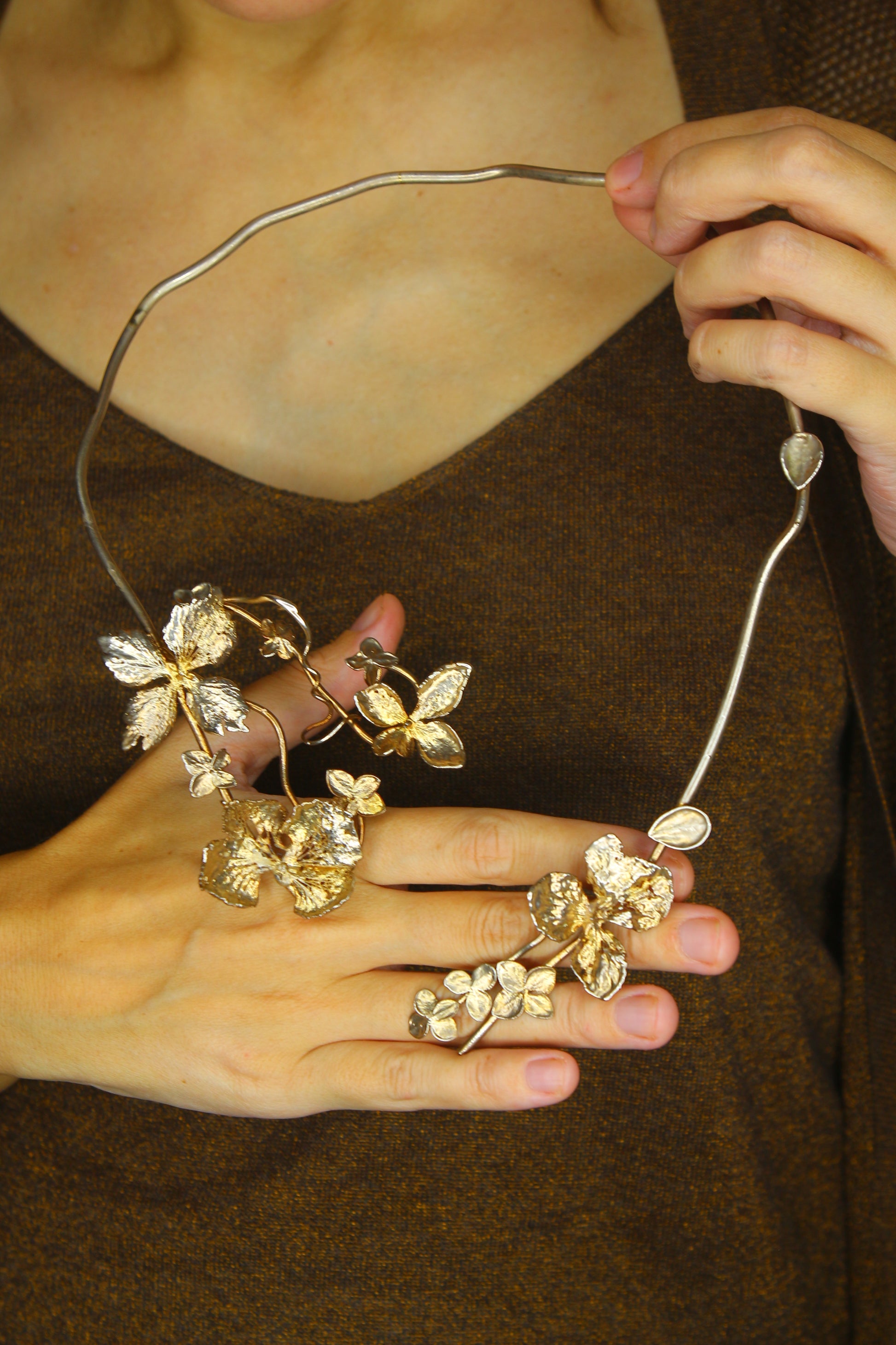 Colar com flores de hortênsia em prata colorida.