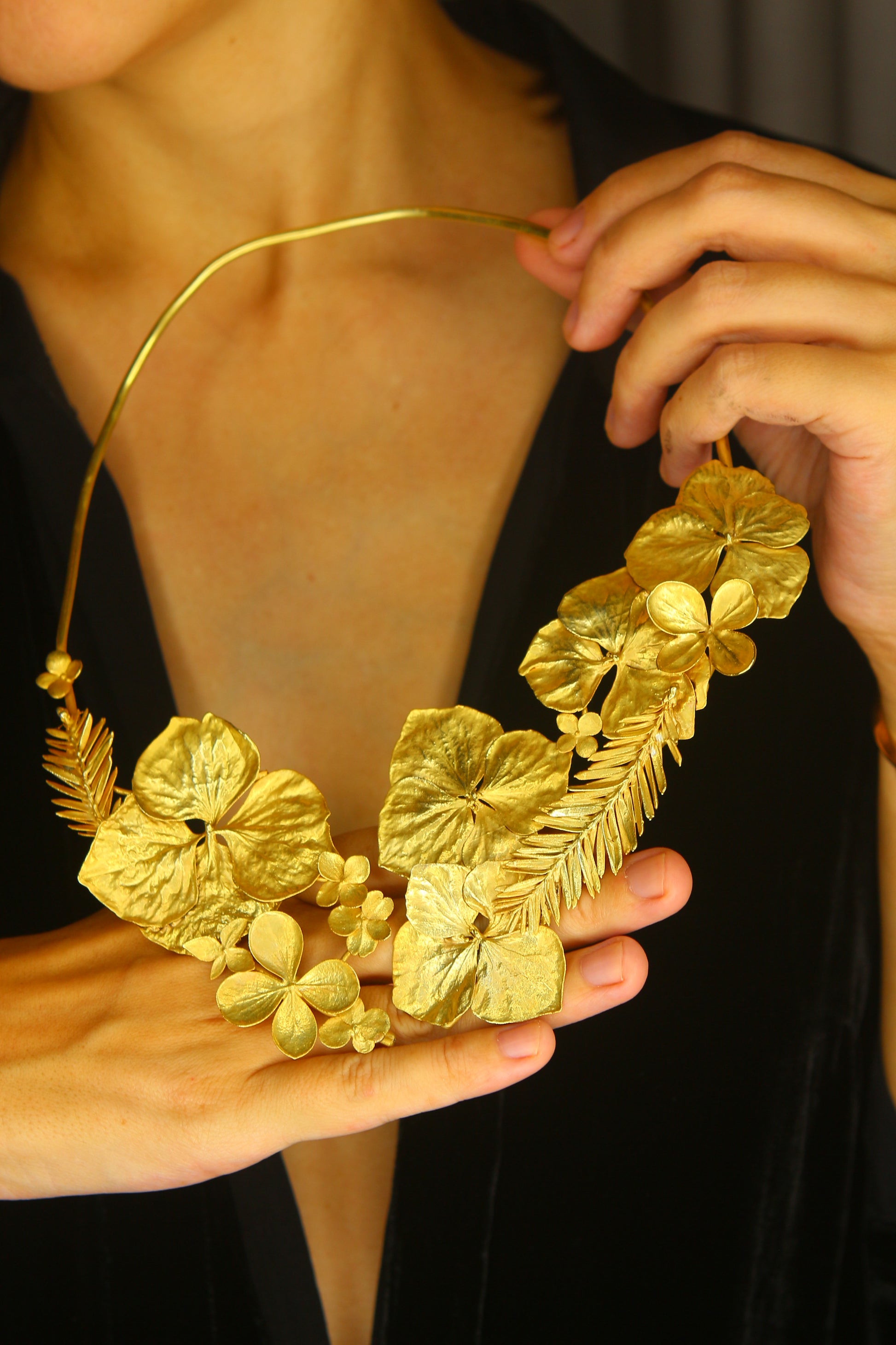 Colar com flores de hortênsia em ouro.
