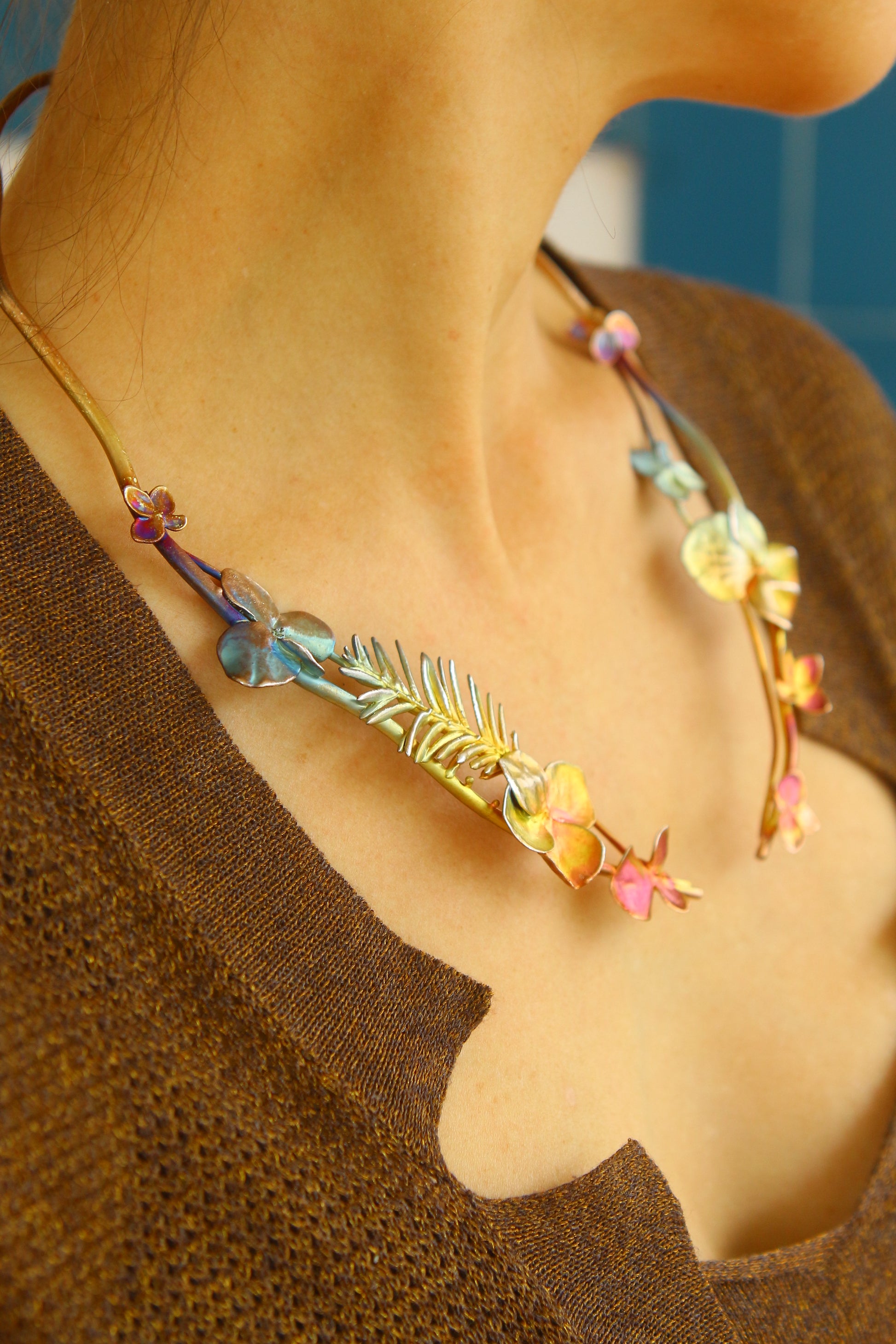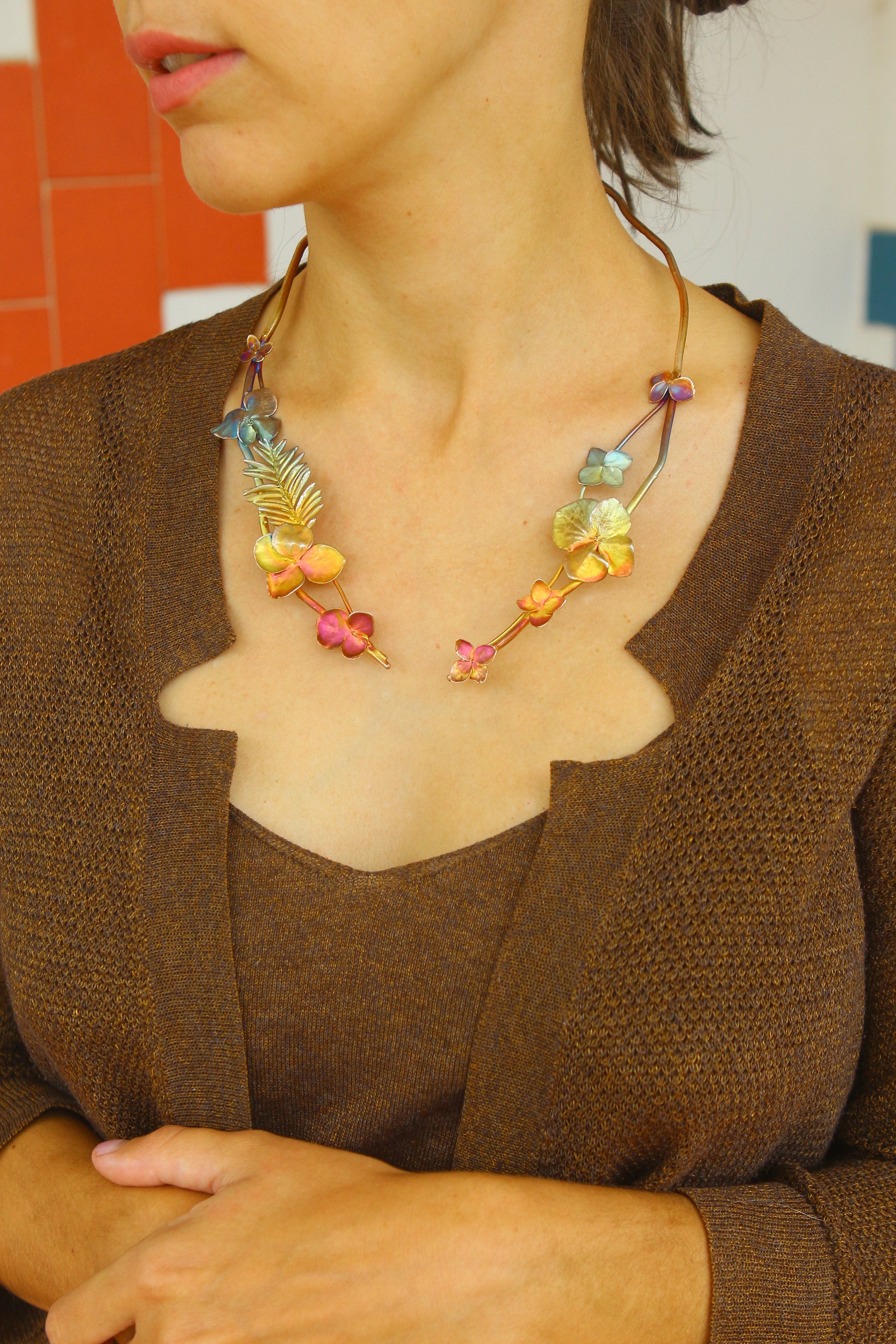 Colar com flores de hortênsia e um raminho de teixo em prata colorida.