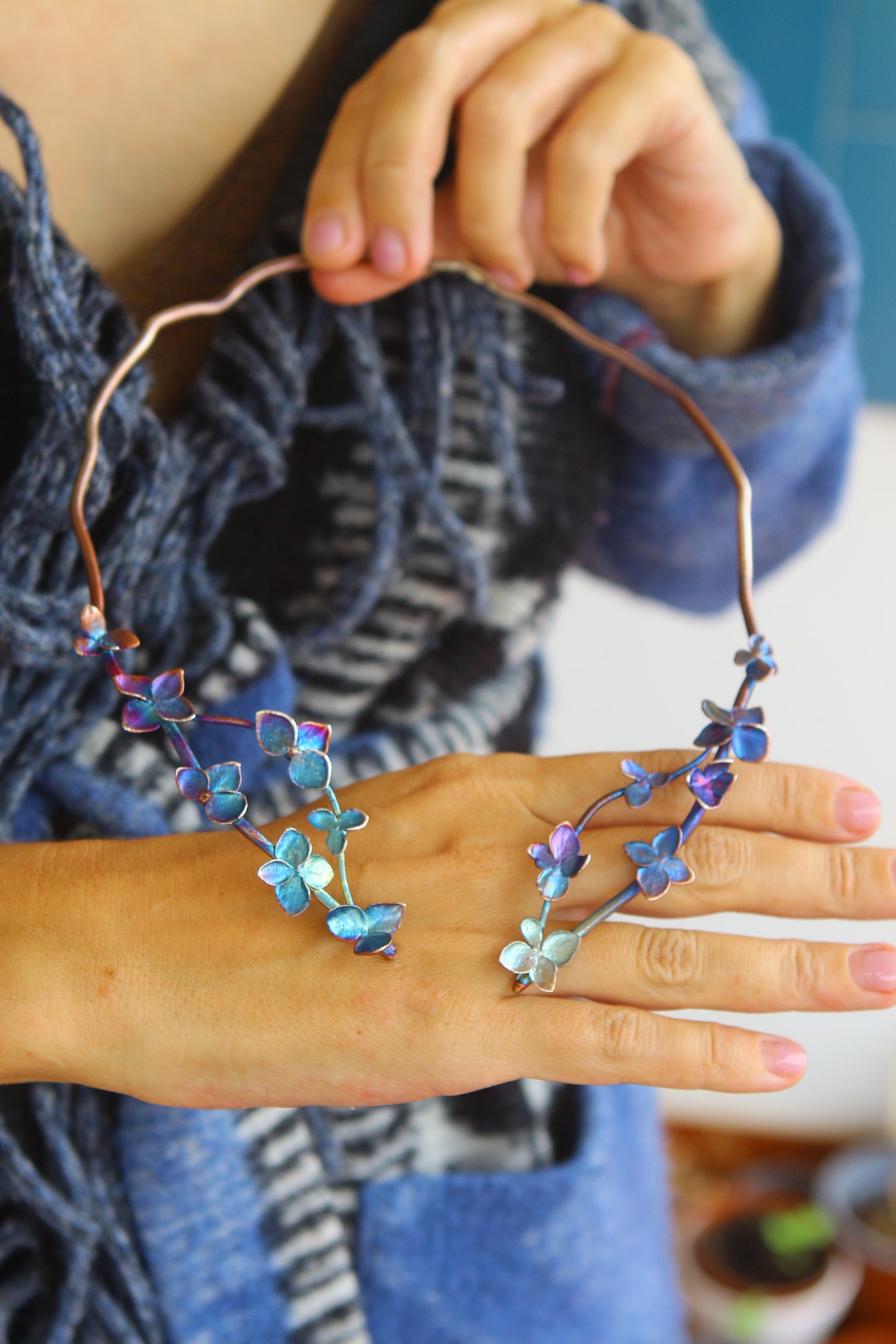 Colar com flores de hortênsia e um raminho de teixo em prata colorida.