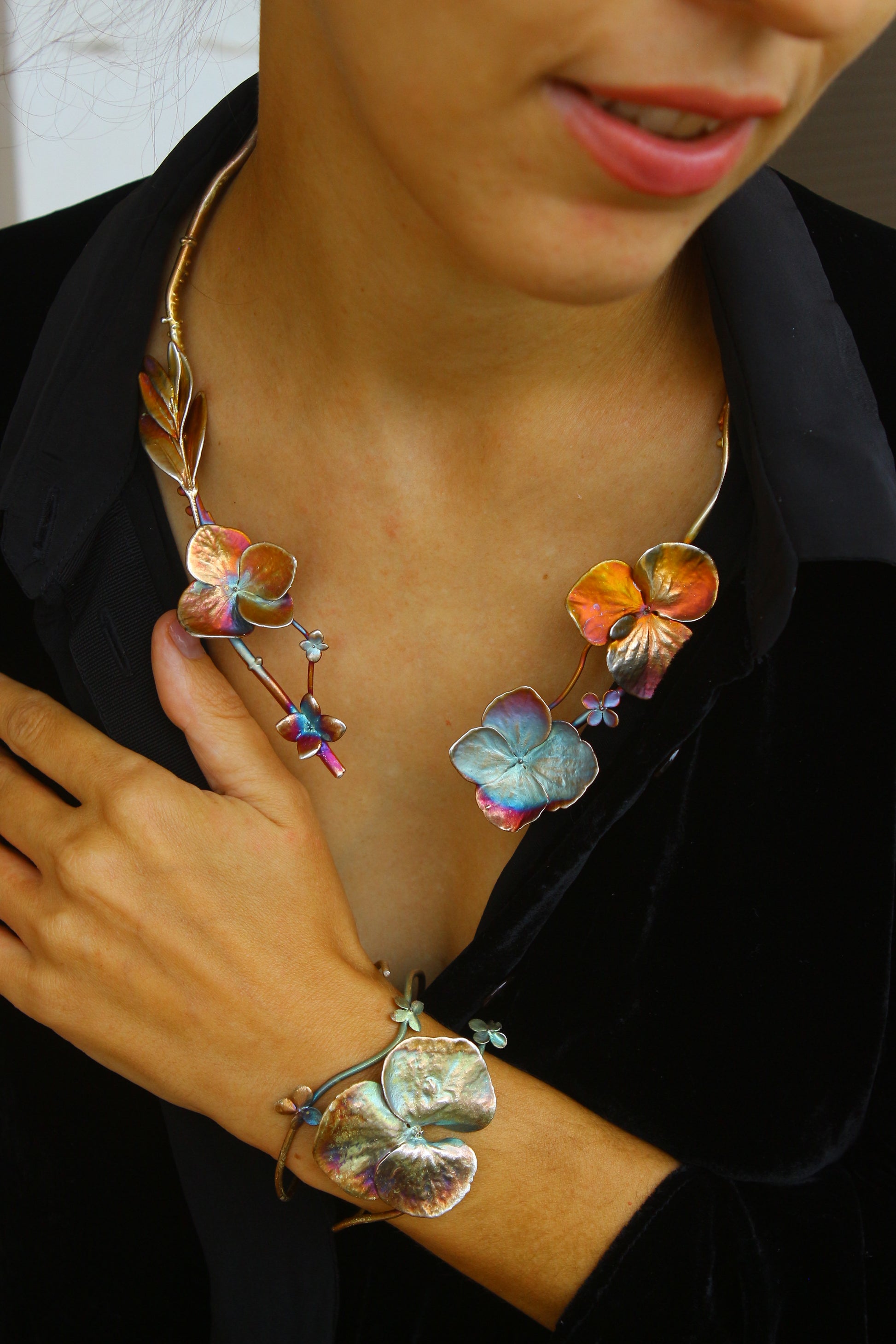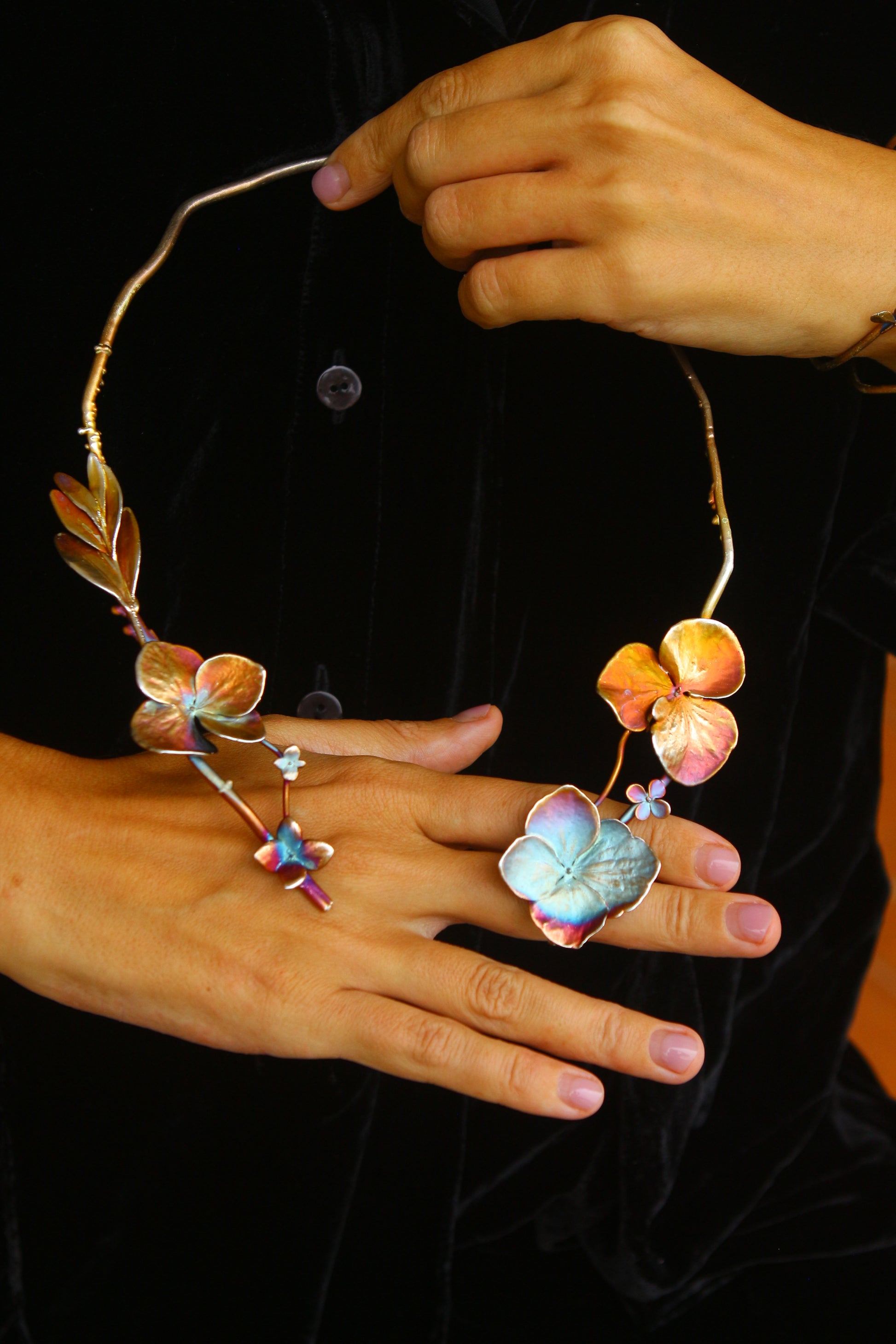 Colar com flores de hortênsia e raminhos de buxo em prata colorida.