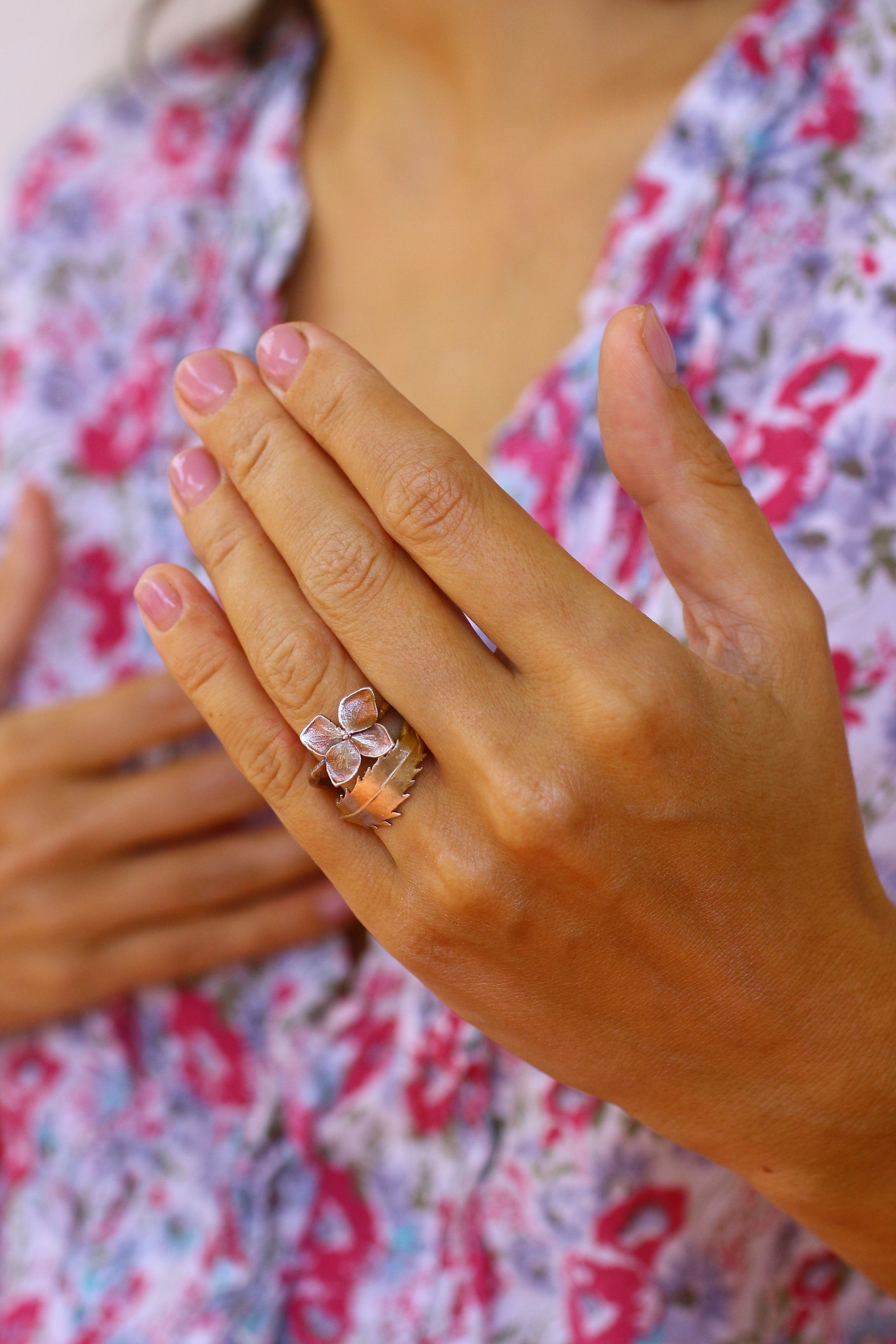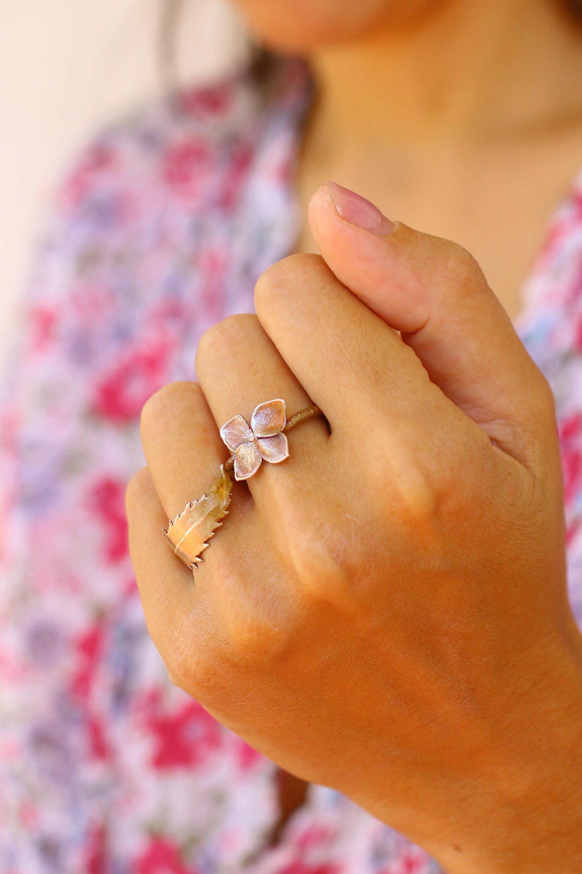 Um conjunto de dois anéis com uma flor de hortênsia e uma folho de tagetes, que podem ser usados tanto no mesmo dedo como em vários. Tamanho ajustável.