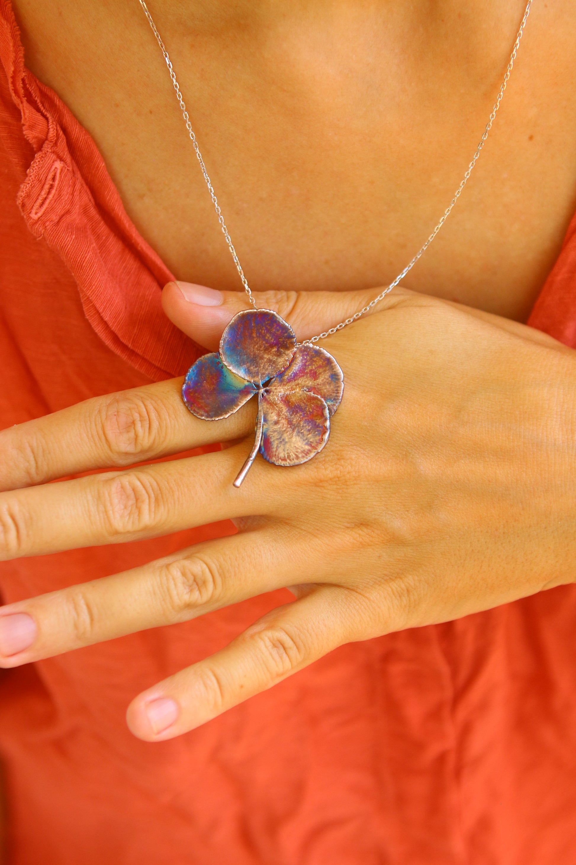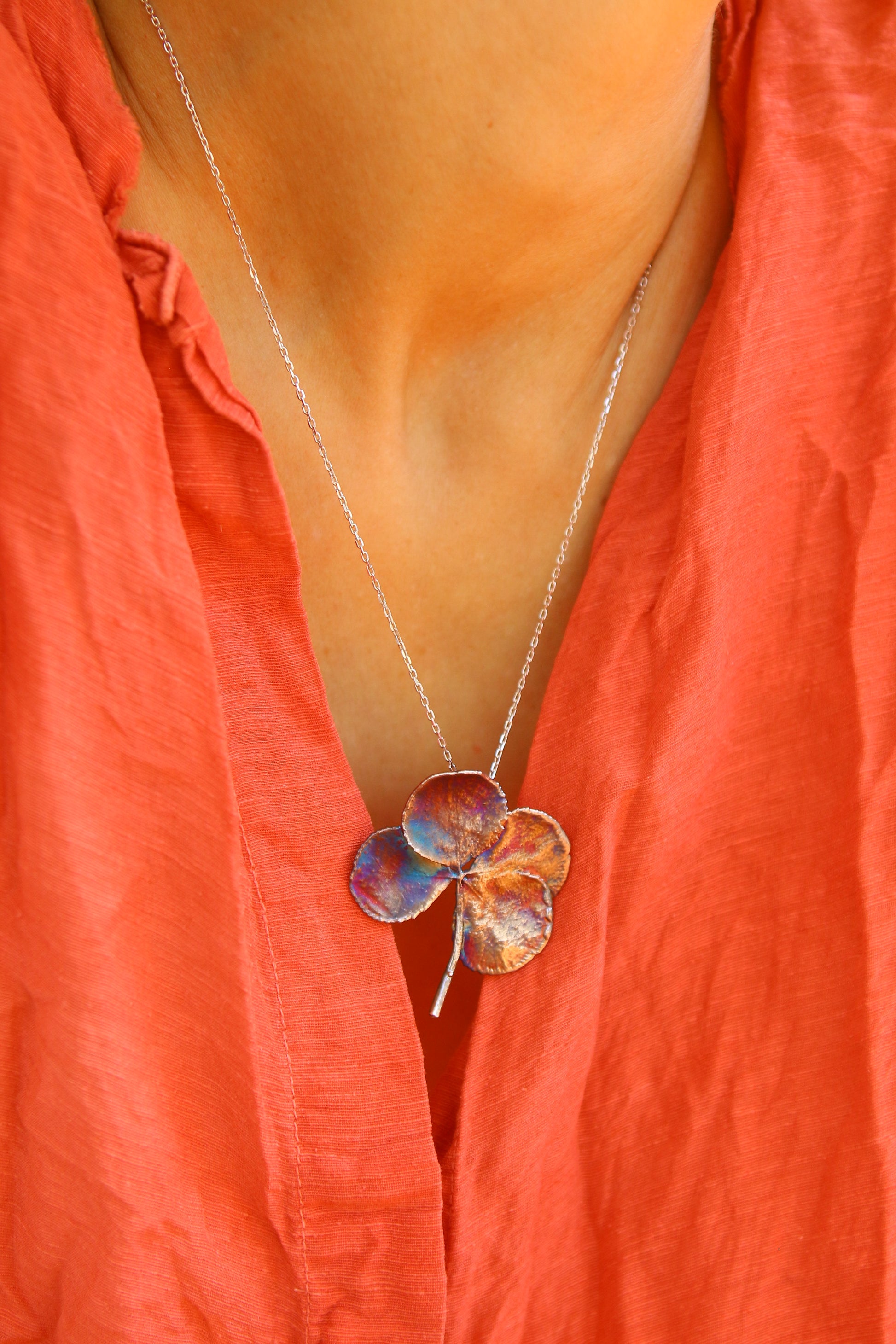 Pendente com folha de trevo de quatro folhas em prata colorida.