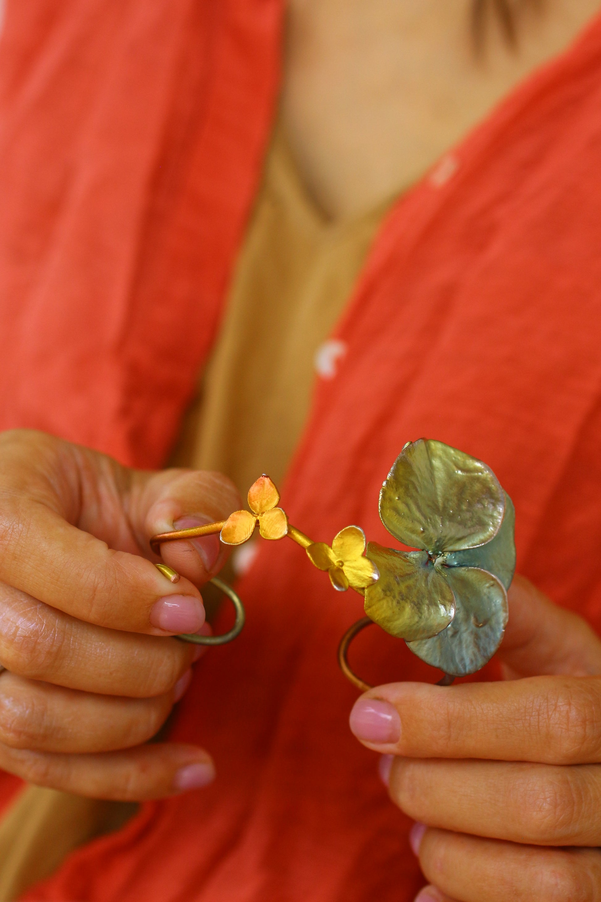 Pulseira com flores de hortênsia em prata colorida. Tamanho ajustável.
