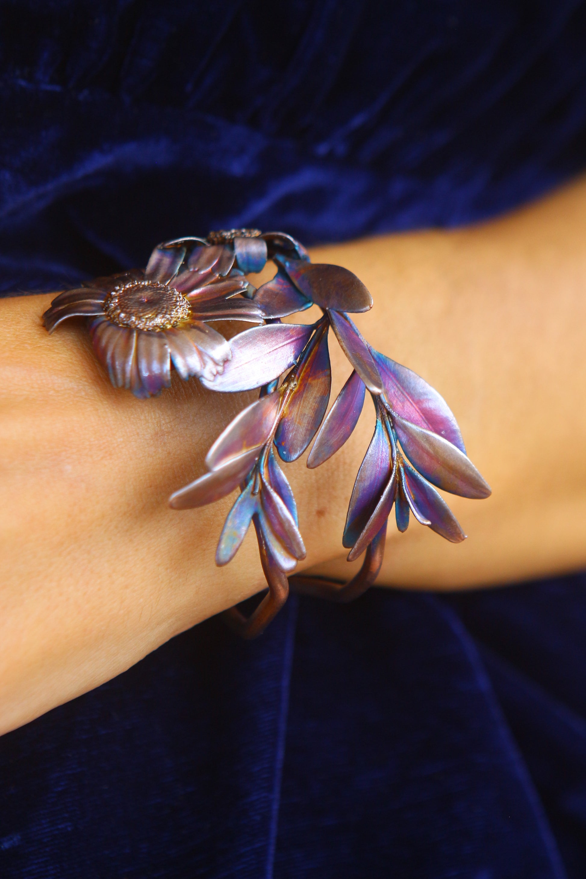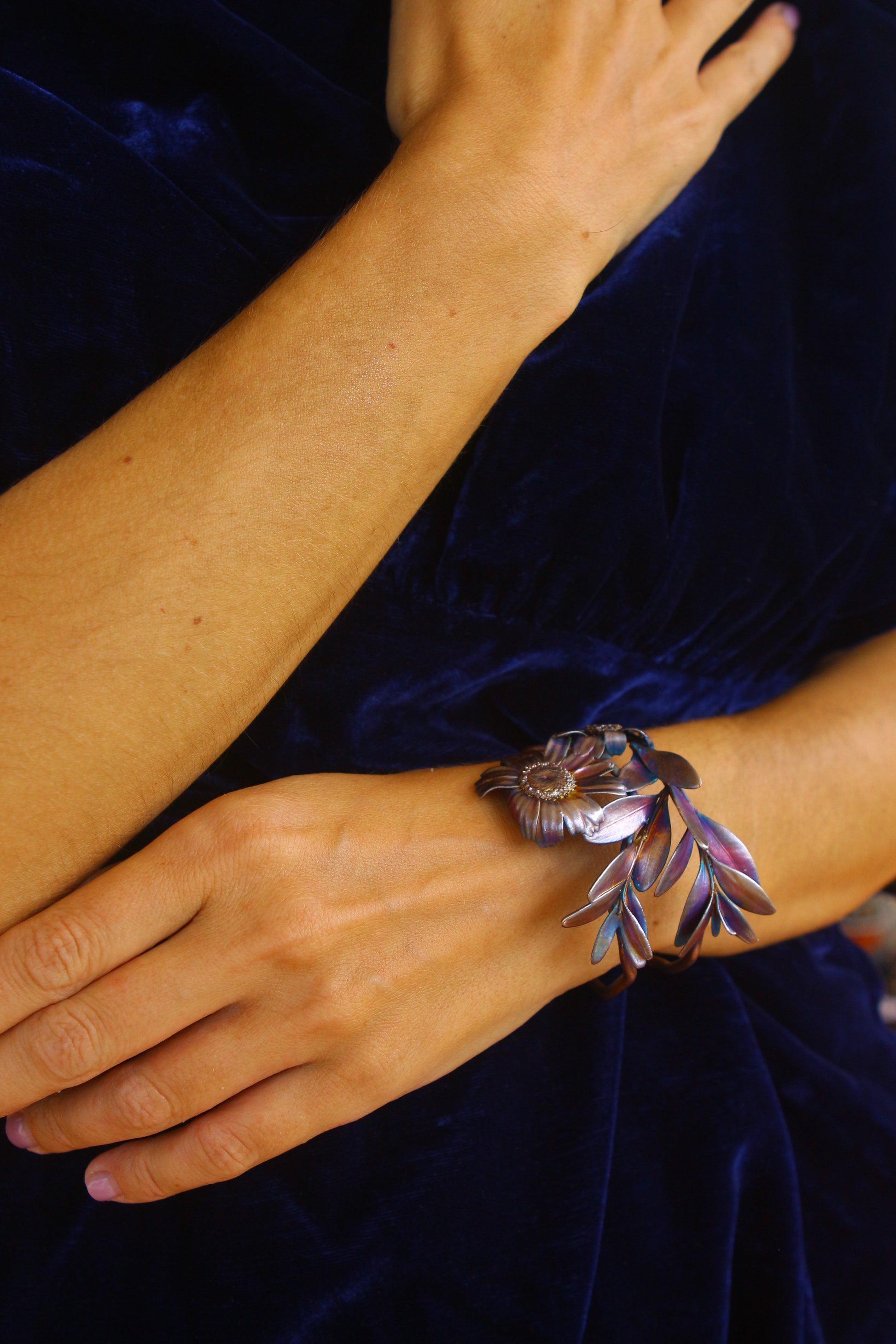 Pulseira com verdadeiras flores silvestres portuguesas e raminhos de buxo em prata colorida. Tamanho ajustável.