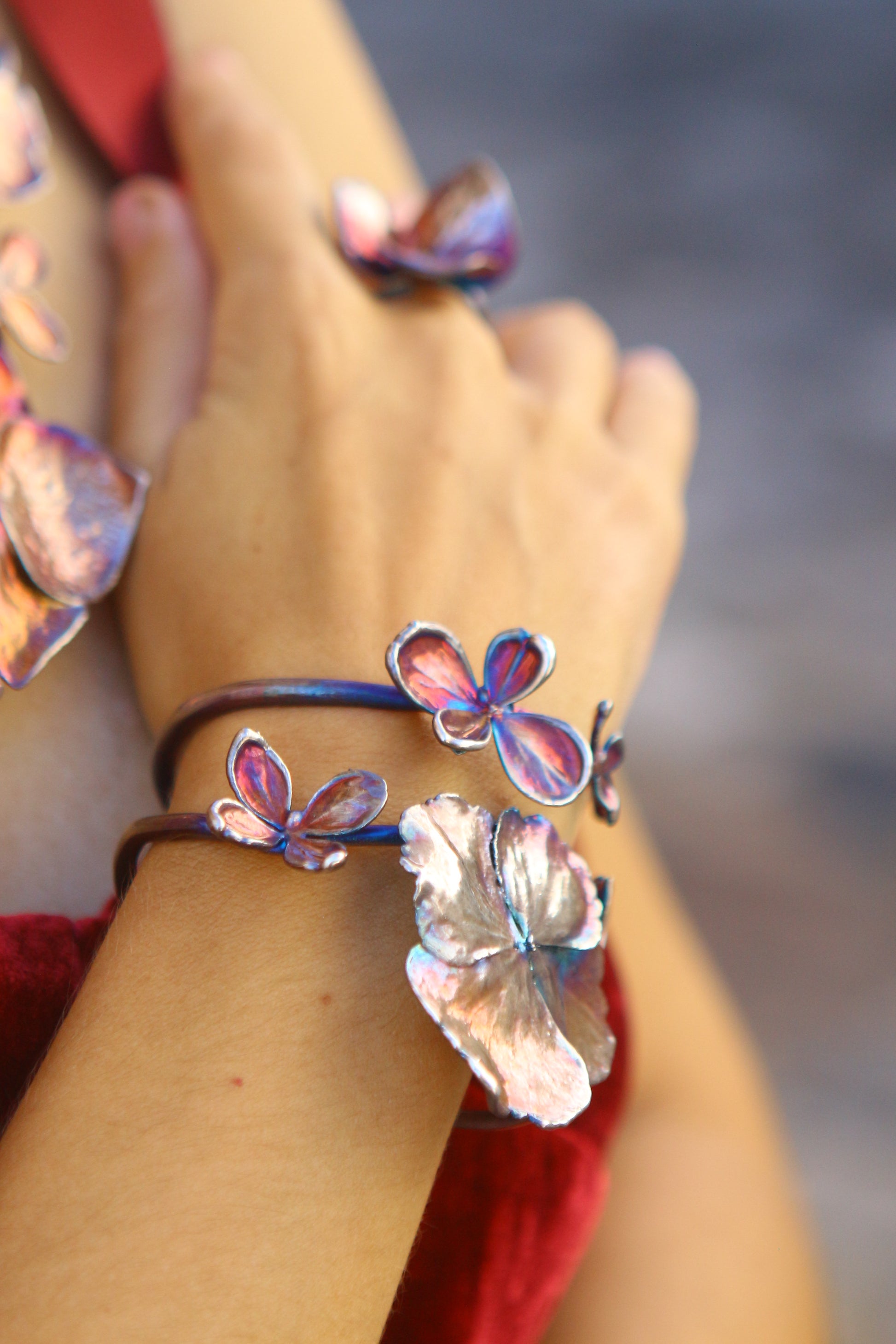 Pulseira com flores de hortênsia em prata colorida. Tamanho ajustável.