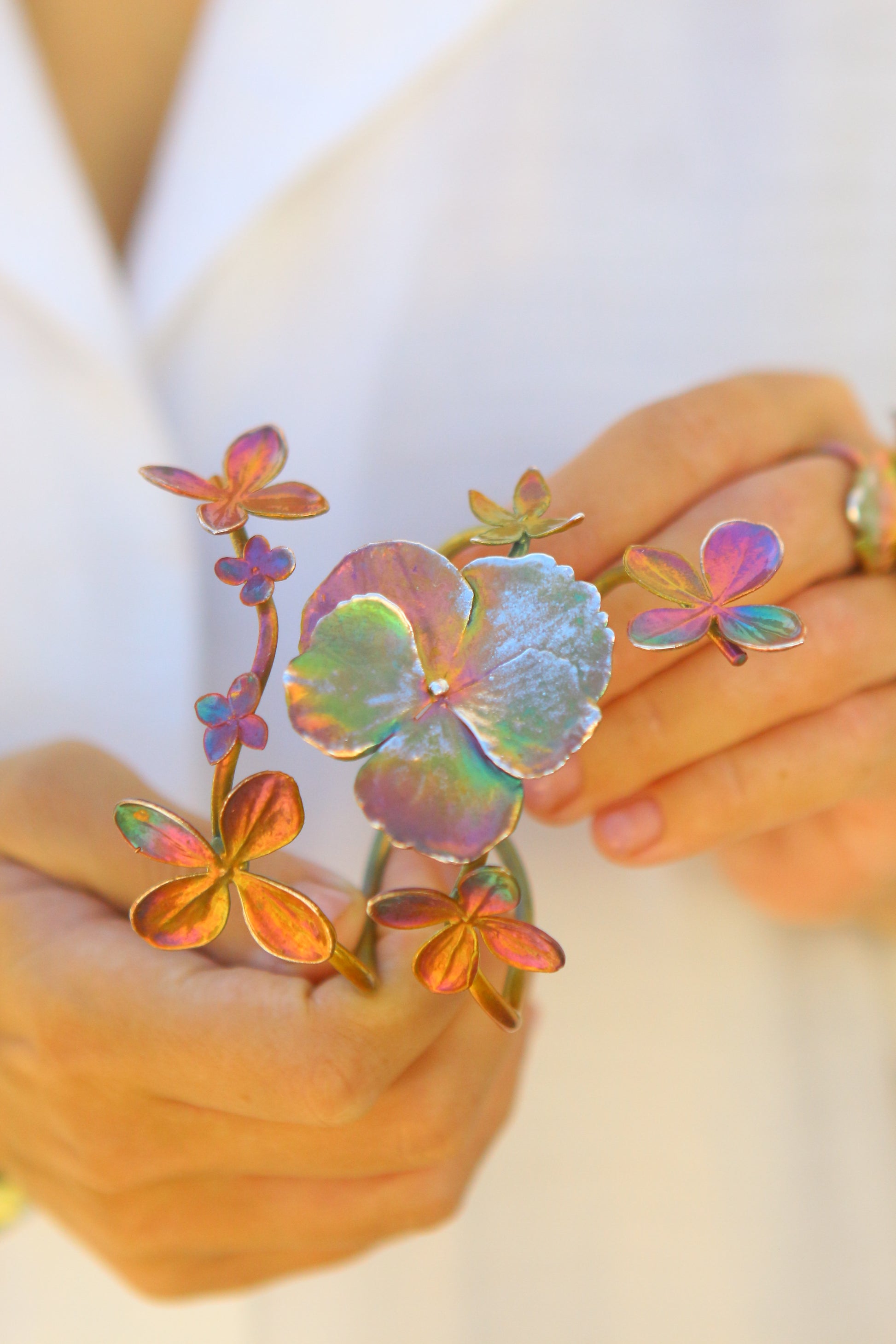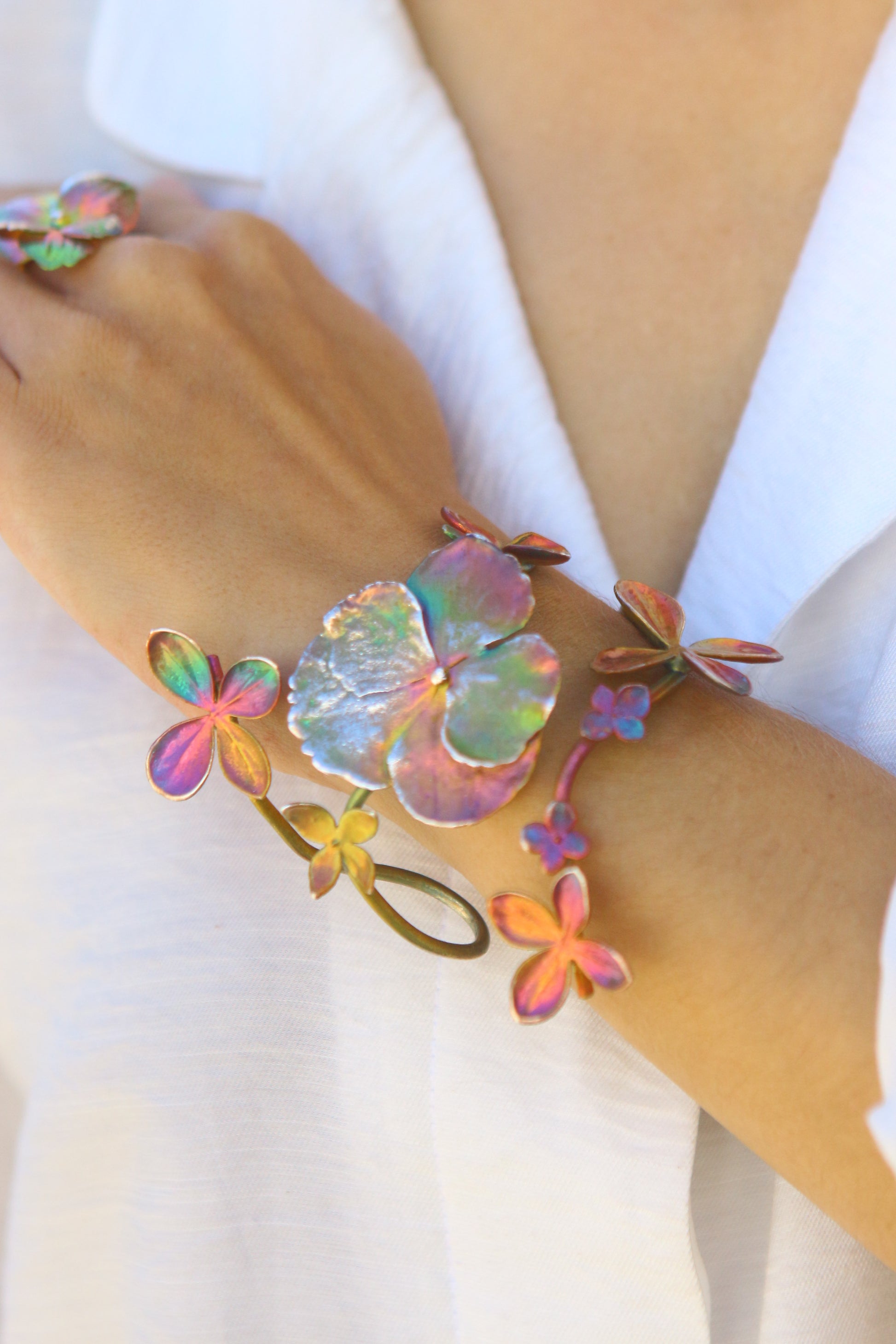 Pulseira com flores de hortênsia em prata colorida. Tamanho ajustável.