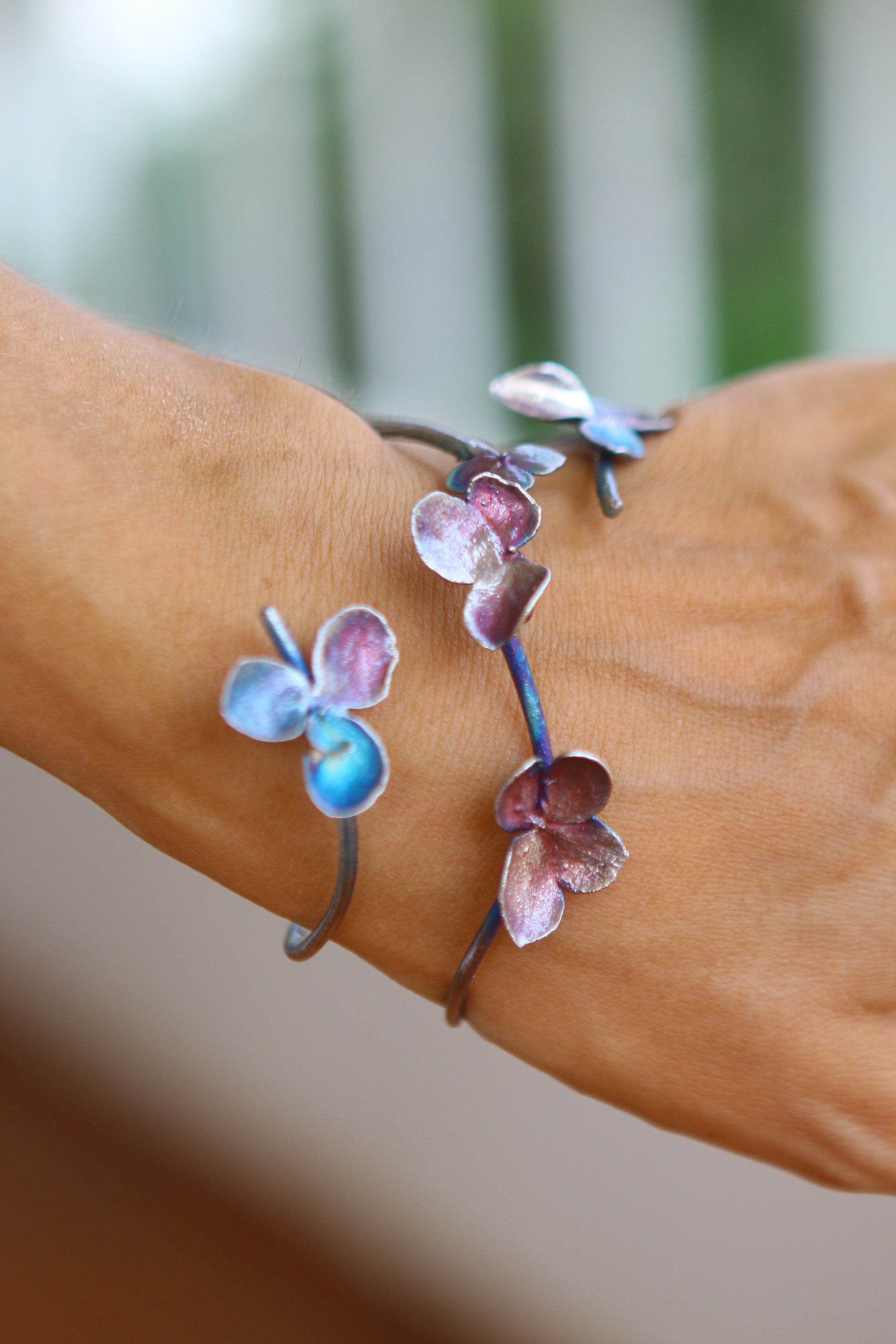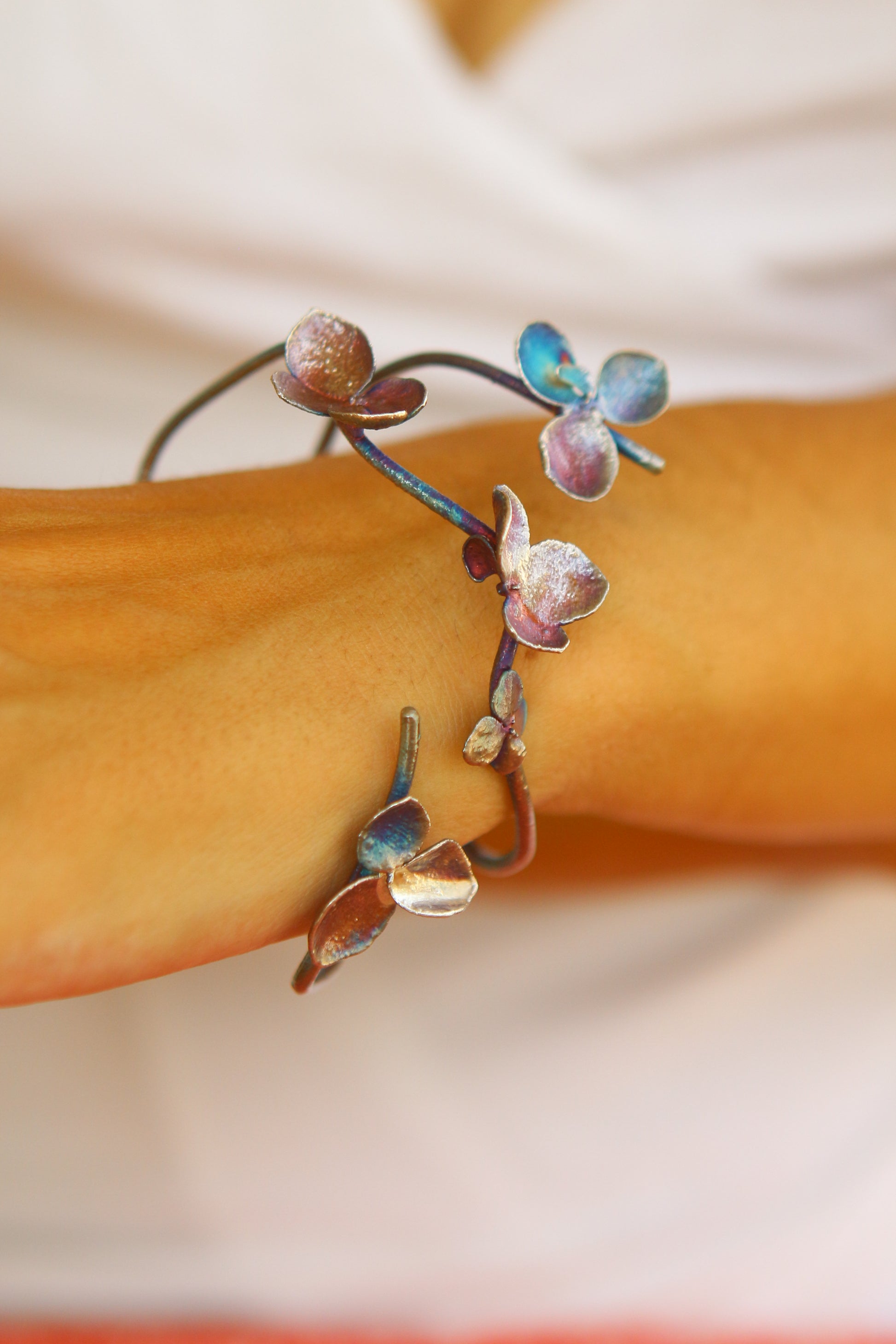 Pulseira com flores de hortênsia em prata colorida. Tamanho ajustável.