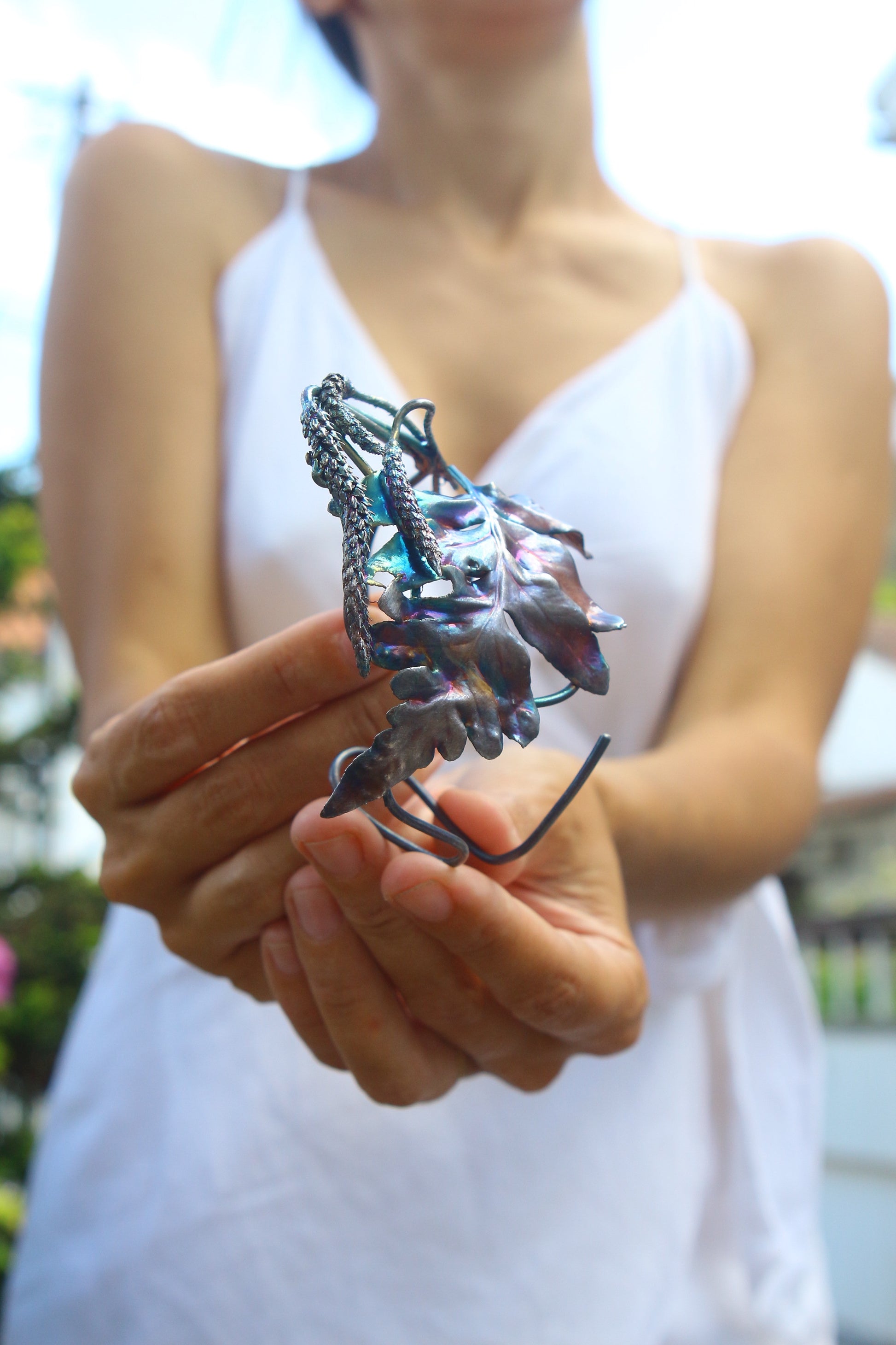 Pulseira com folha de feto e flores de tanchagem em prata colorida. Tamanho ajustável.