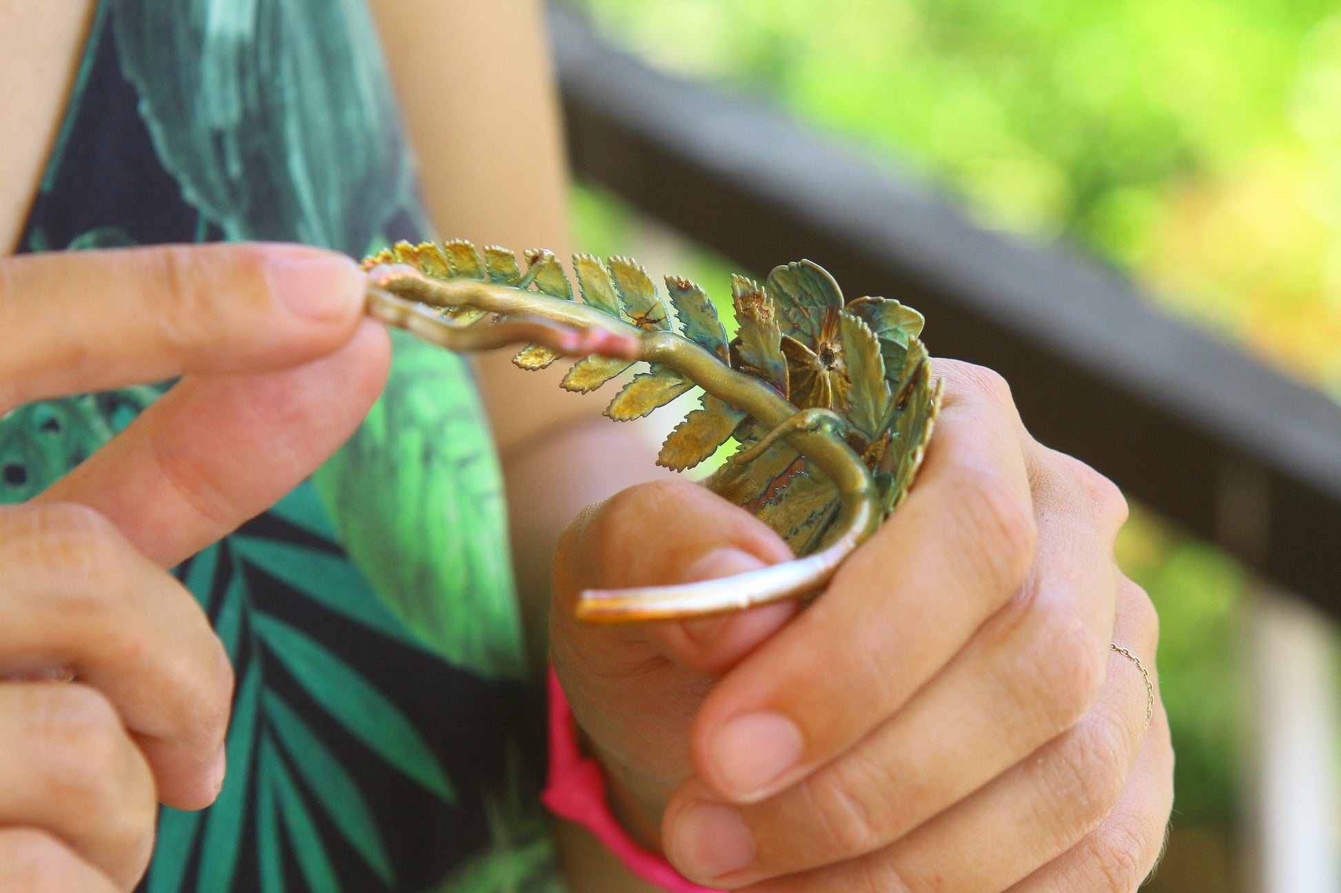 Pulseira com folha de feto e flores de hortênsia em prata colorida. Tamanho ajustável.