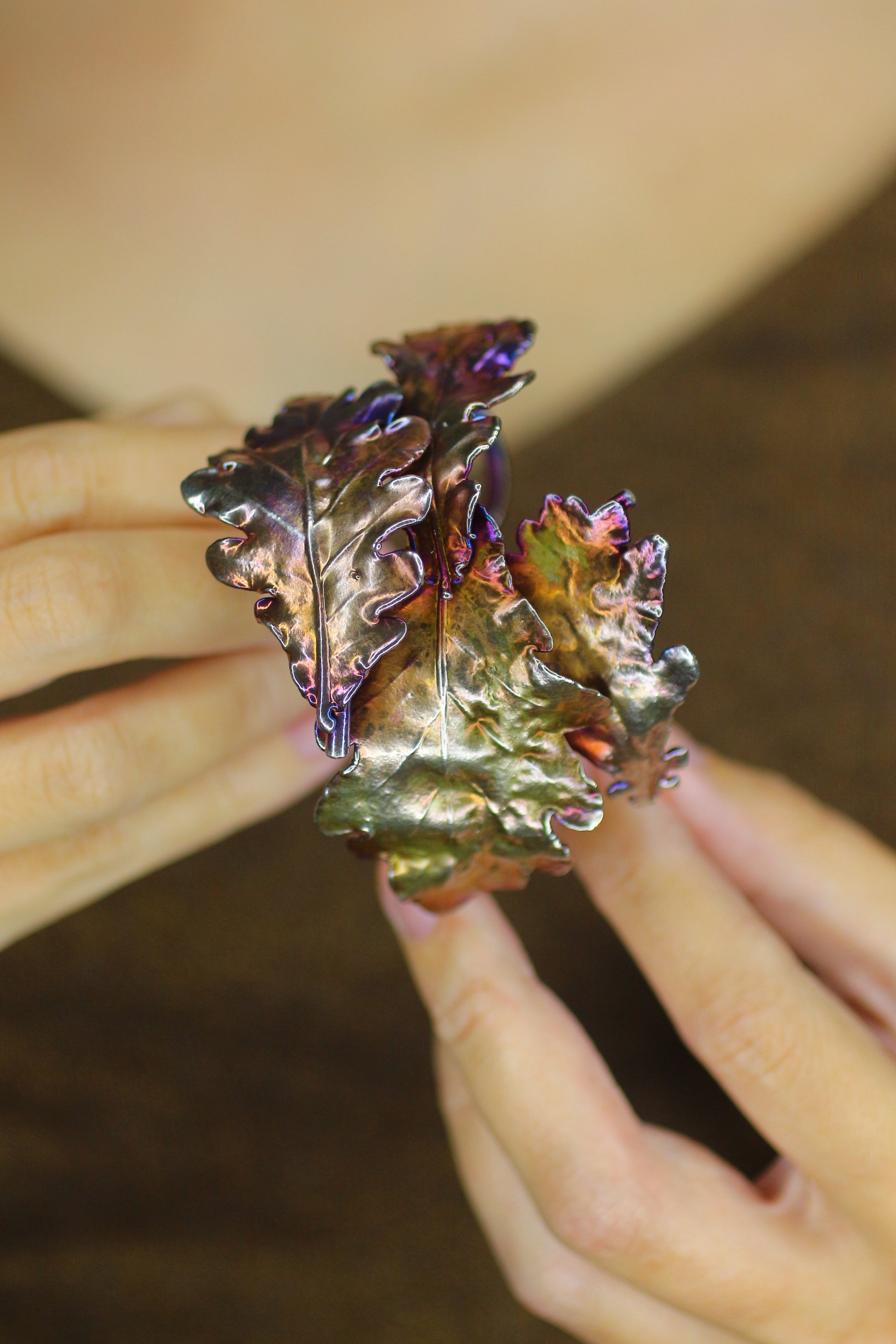 Pulseira com folhas de carvalho em prata colorida. Tamanho ajustável.