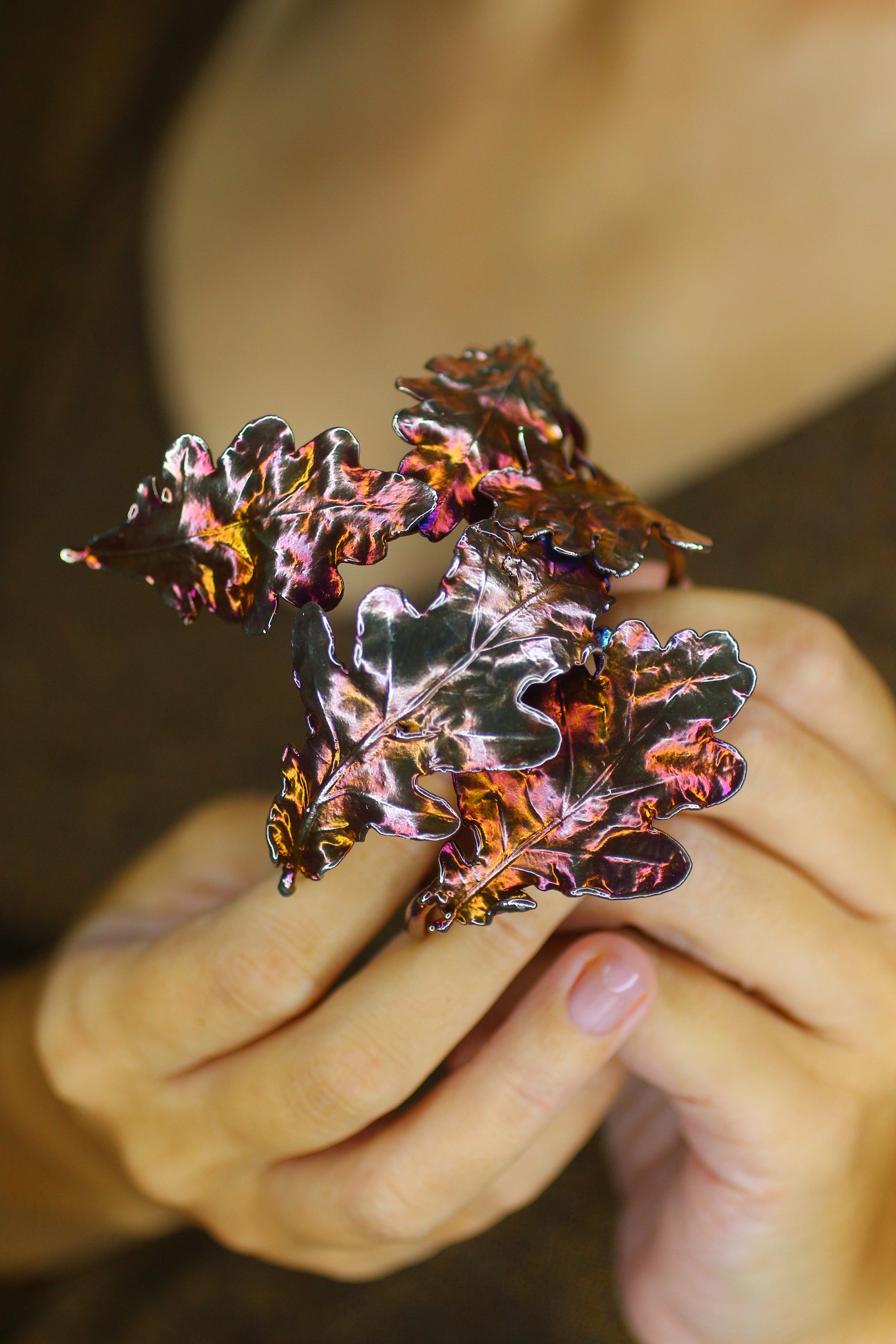 Pulseira com folhas de carvalho em prata colorida. Tamanho ajustável.